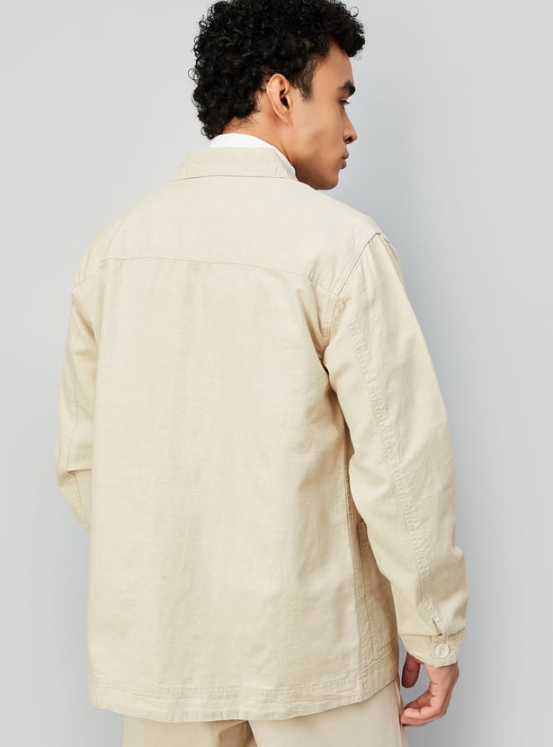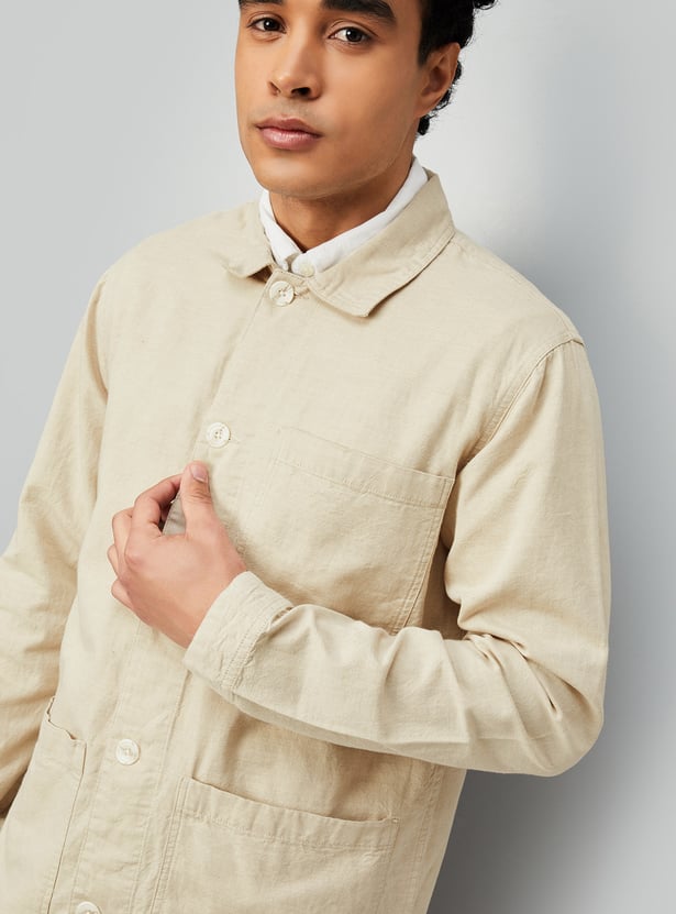 Effortlessly bridging the gap between a shirt and a jacket, this solid shacket is your go-to layer for in-between weather. It features a spread collar, button placket, full sleeves with button cuffs, and a front patch pocket — combining structure and comfort in one versatile piece.