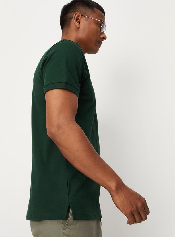 A wardrobe must, this T-shirt is styled with a polo collar, short sleeves, a patch pocket, and side slits at the hem. It is tailored in a slim fit profile with a striped pattern. Amp your look by teaming this T-shirt with pair of trousers and casual lace-ups