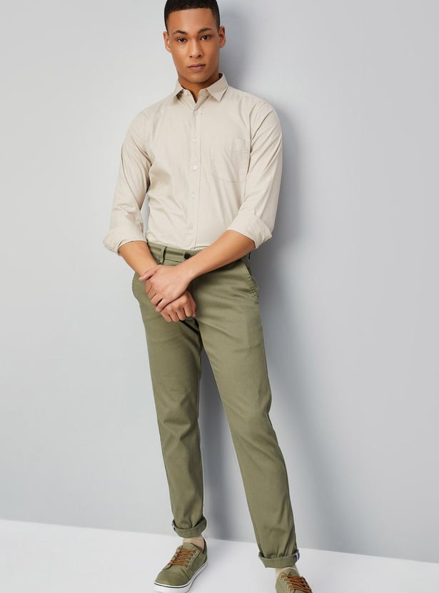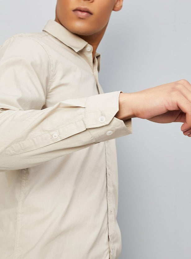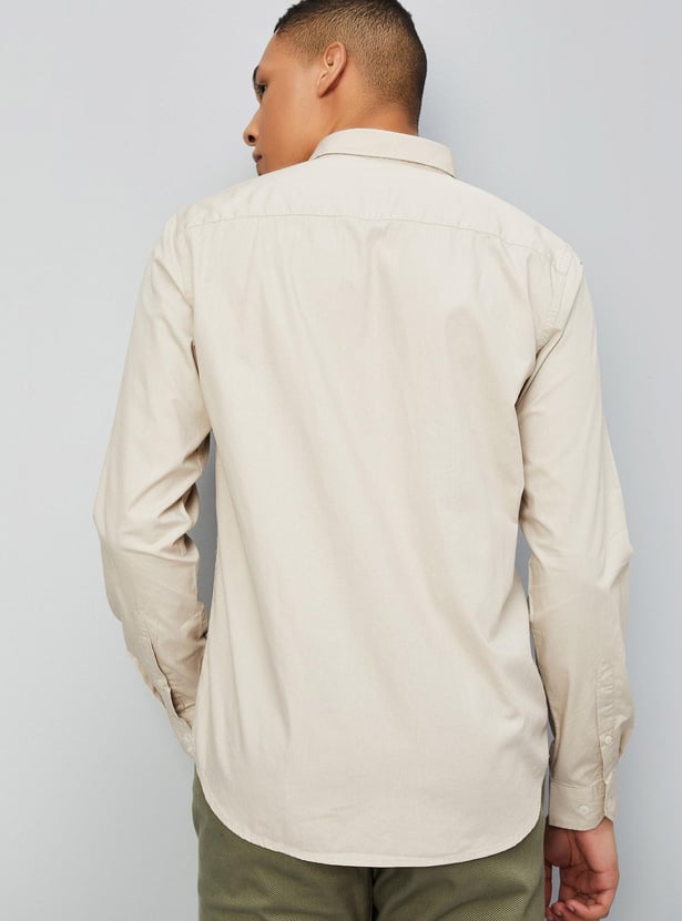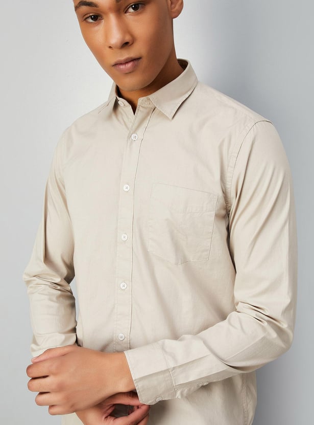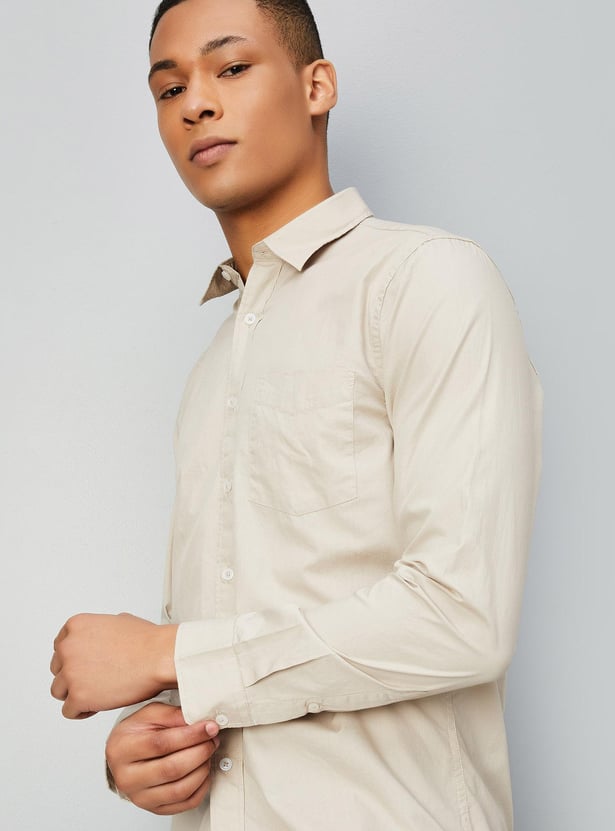 Dress up your style with this shirt tailored to a slim-fit profile. It has a spread collar, full sleeves, buttoned cuffs, a patch pocket on the chest, and a curved hem. Tuck in this shirt in a pair of trousers and loafers to ace your style.