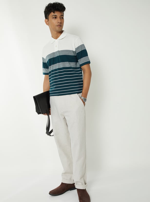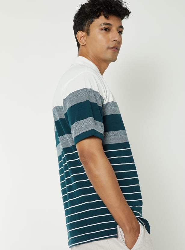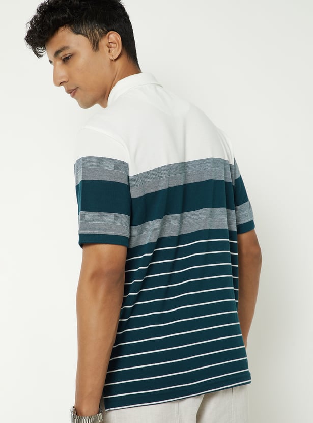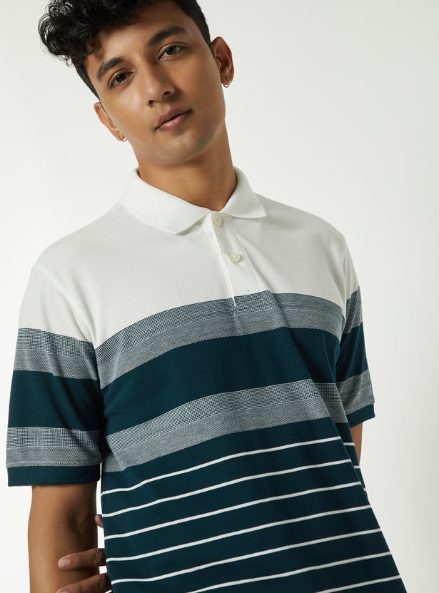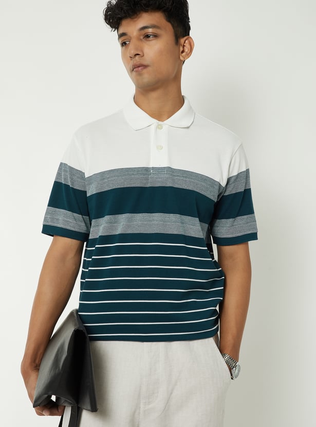 Step up your casual style with this striped polo T‑shirt, featuring a classic polo collar and half sleeves. The timeless stripes add a sporty edge, making it perfect for everyday wear.