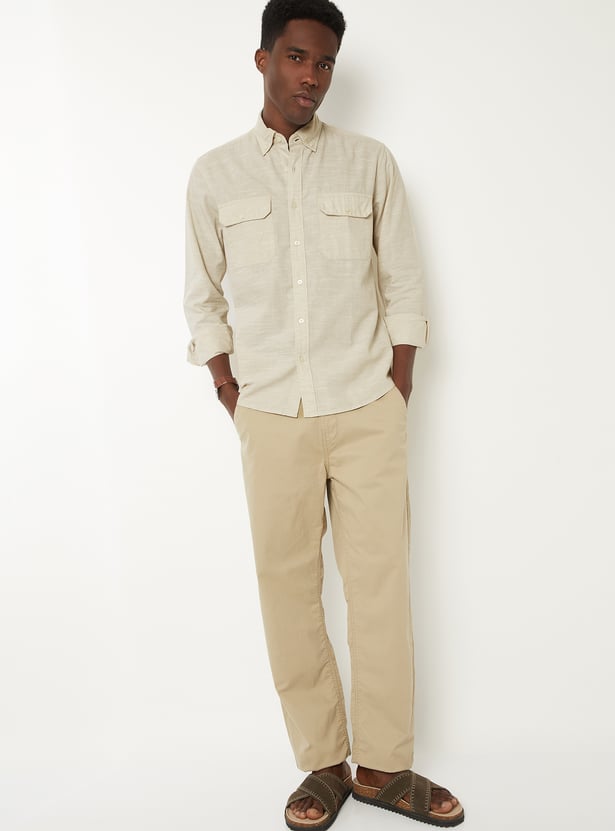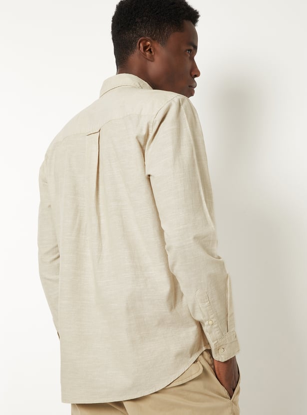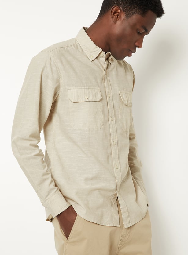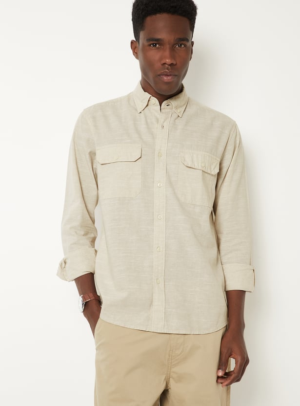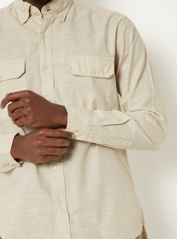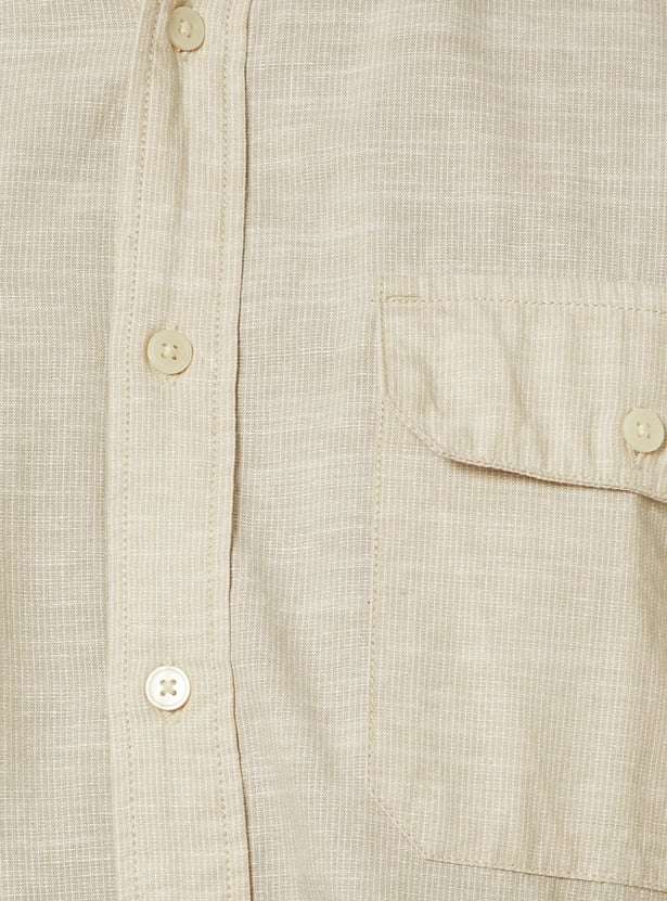Striped regular fit shirt designed with a classic spread collar, full cuffed sleeves, and a clean button-down front. Finished with double pockets for added structure and everyday versatility.