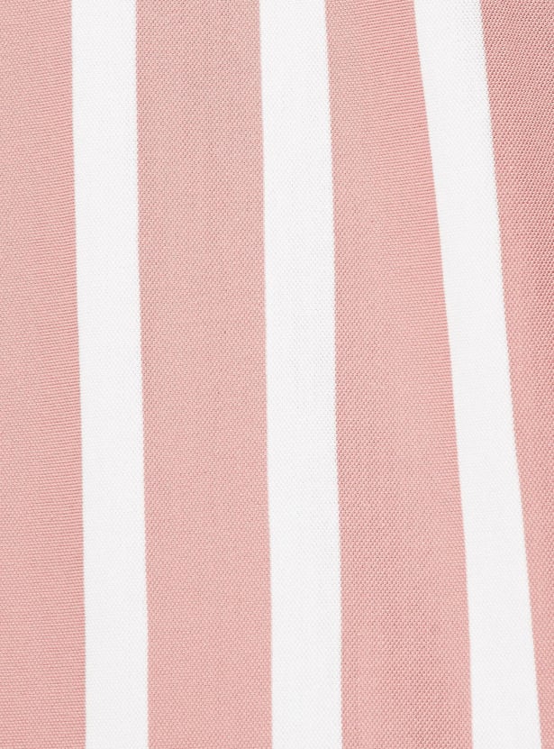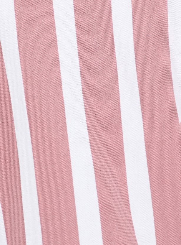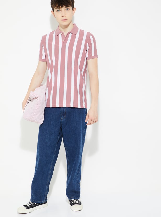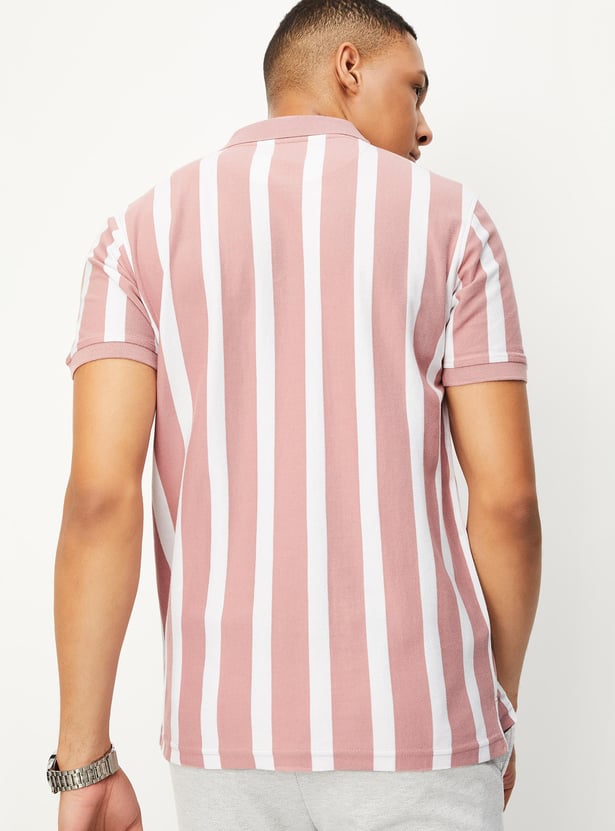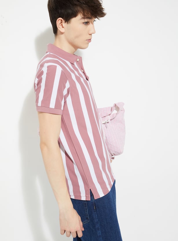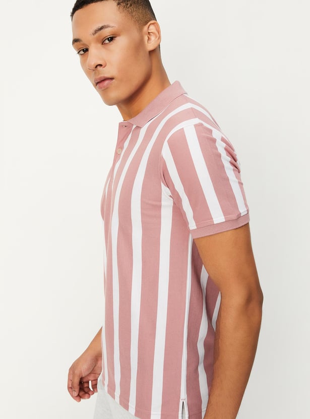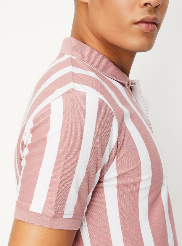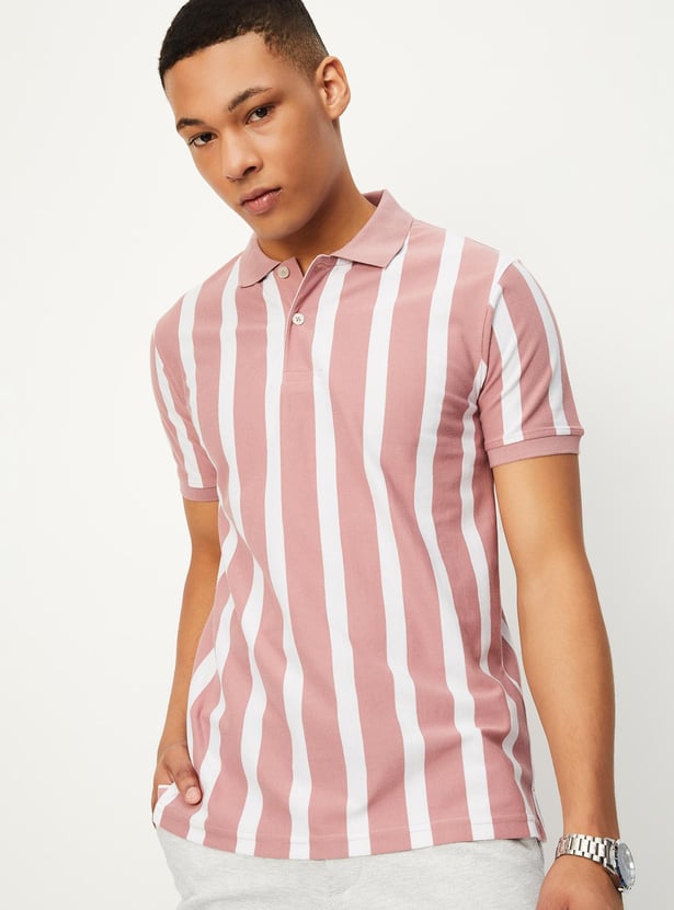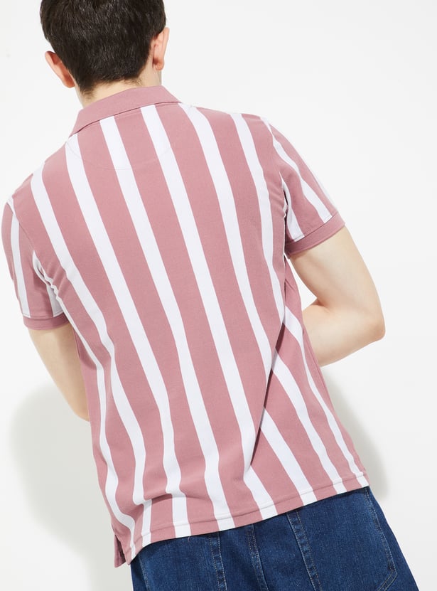 This striped polo t-shirt with short sleeves, a polo collar, and a button placket adds a fashionable flair to your casual outfit.