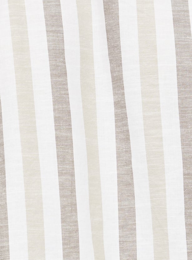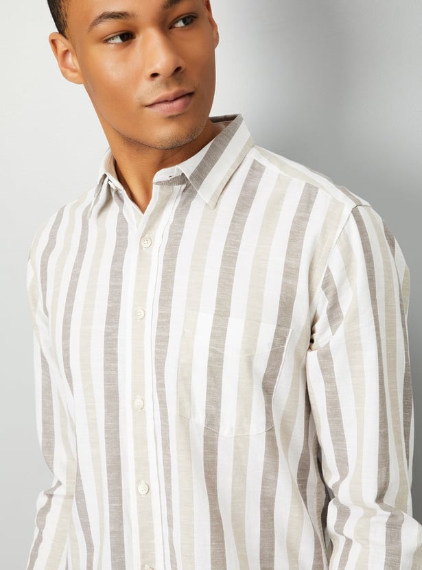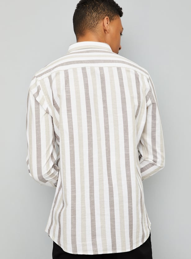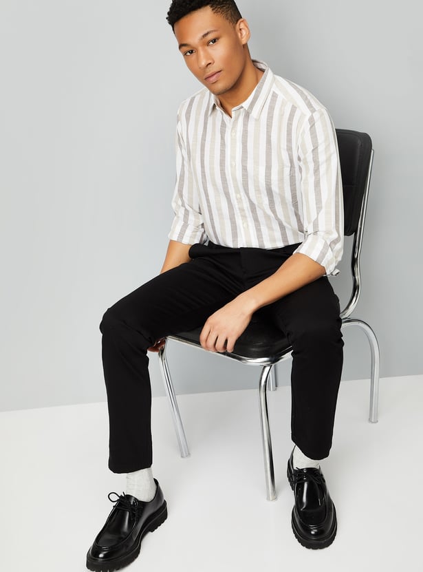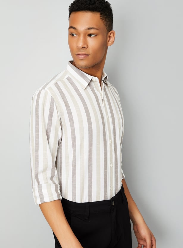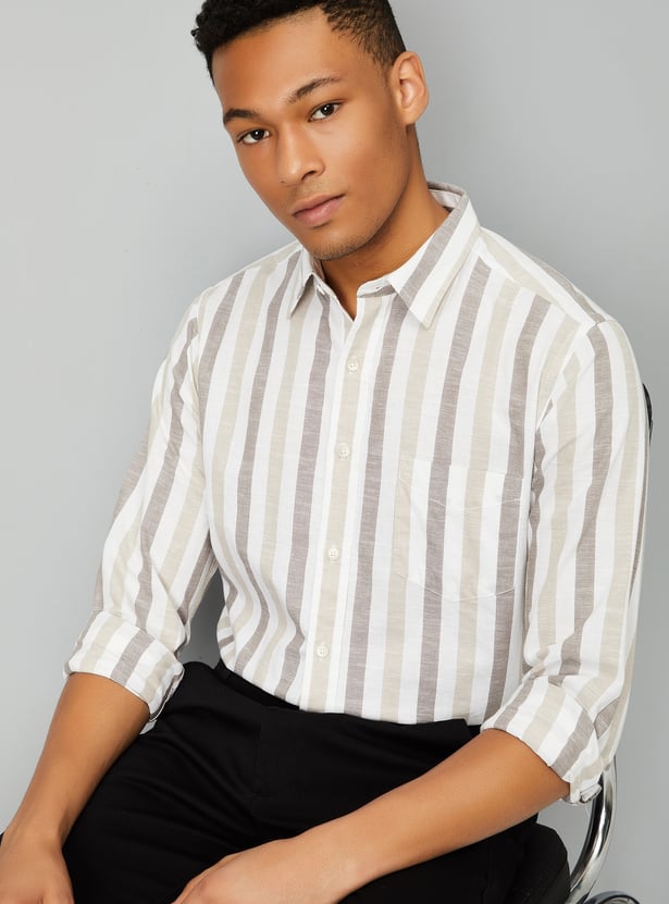 This striped slim-fit shirt is a perfect blend of sharp style and comfort. With full sleeves, button cuffs, and a spread collar, it brings a refined touch to any look. Featuring a button closure and a patch pocket for added utility, it’s versatile enough for both casual and semi-formal occasions.