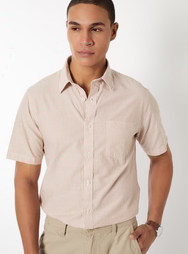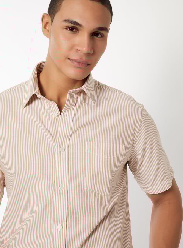 Keep it crisp and contemporary with this striped slim fit shirt, featuring a sharp spread collar, classic button placket, and half sleeves for a relaxed feel. The slim fit offers a tailored silhouette, perfect for smart-casual occasions.