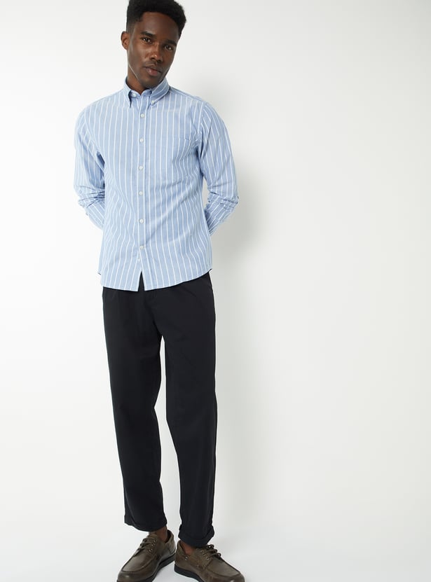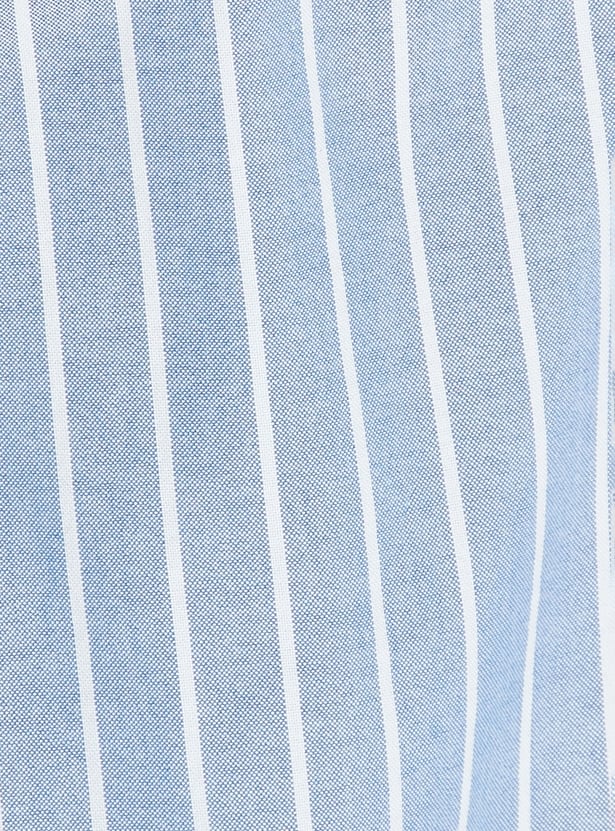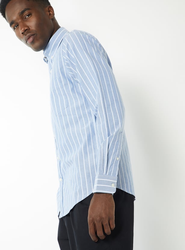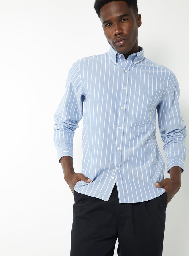 This striped slim-fit shirt is designed for a sharp, contemporary look. It features full cuffed sleeves, a button placket, a button-down collar, and a curved hem for a refined finish.