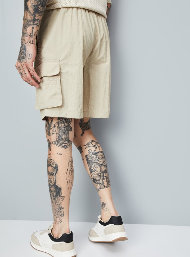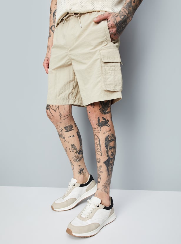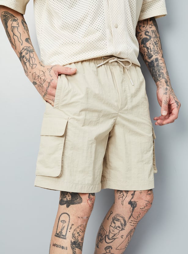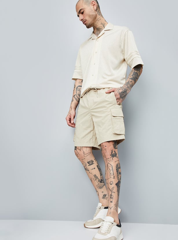 These textured cargo shorts feature a drawstring closure and spacious cargo pockets, offering both comfort and practicality for an active lifestyle. The textured fabric adds a cool, rugged touch.