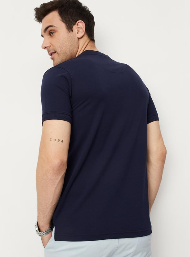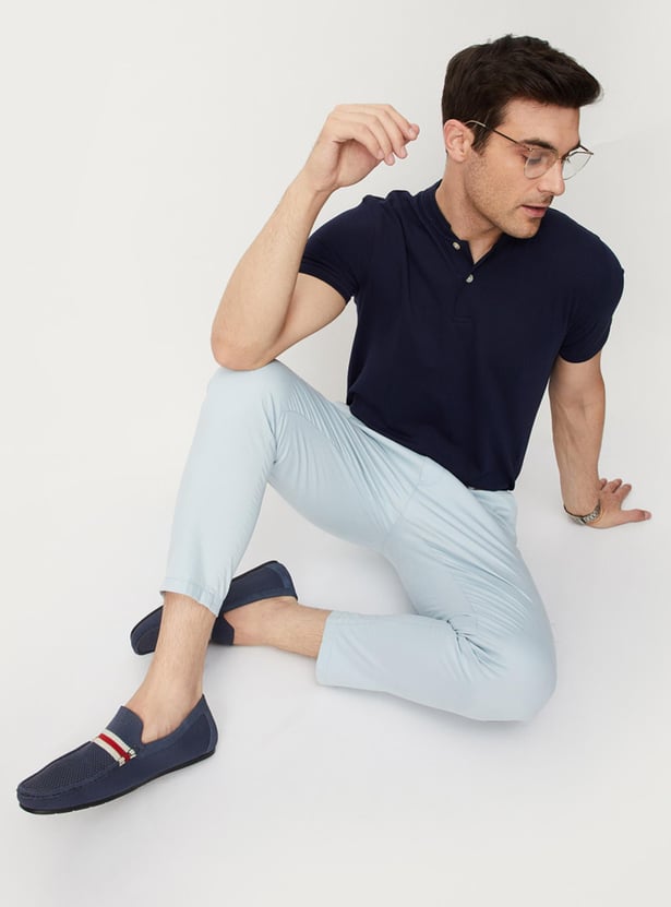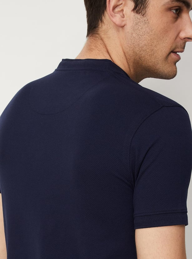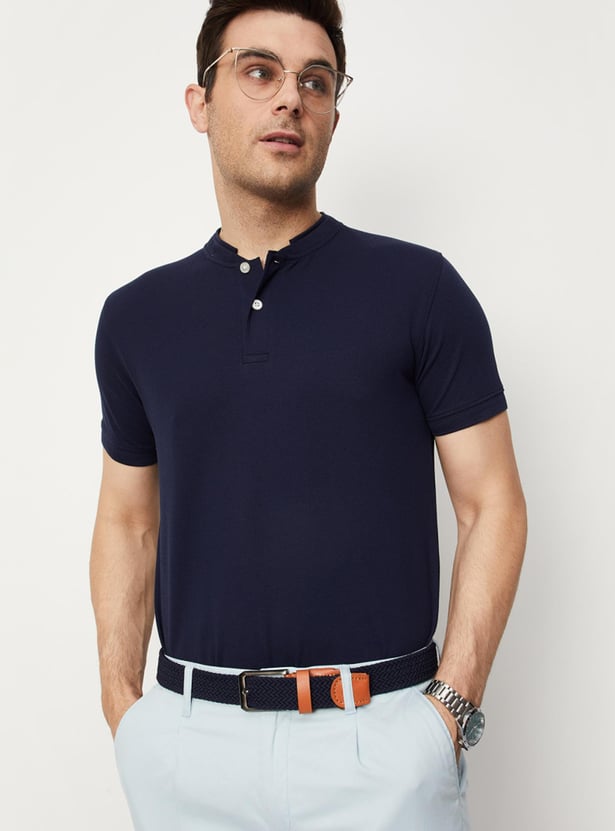 Go from work to weekend in the comfort and style of this slim-fit polo. It features a textured pattern, a band collar, short sleeves, ribbed trim, and side slits at the hem. Smarten your outfit by teaming this T-shirt with a pair of trousers and casual lace-ups.