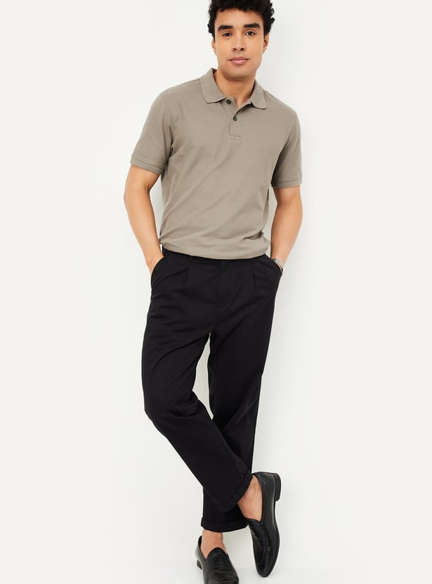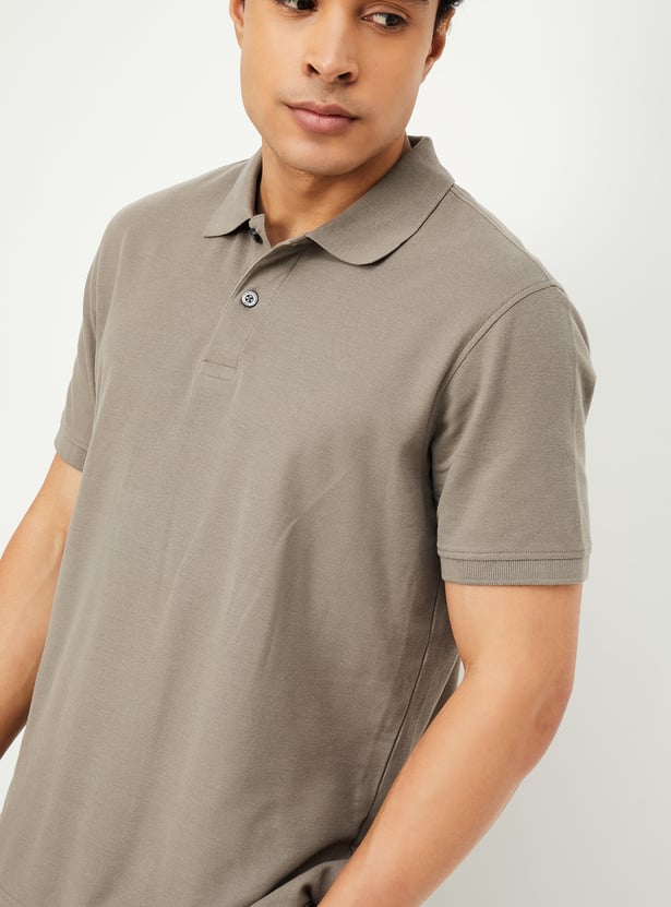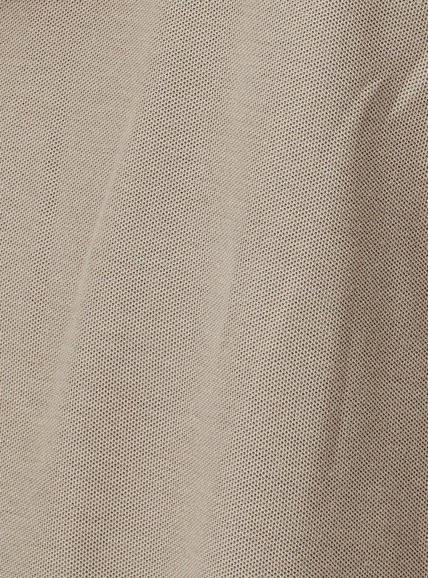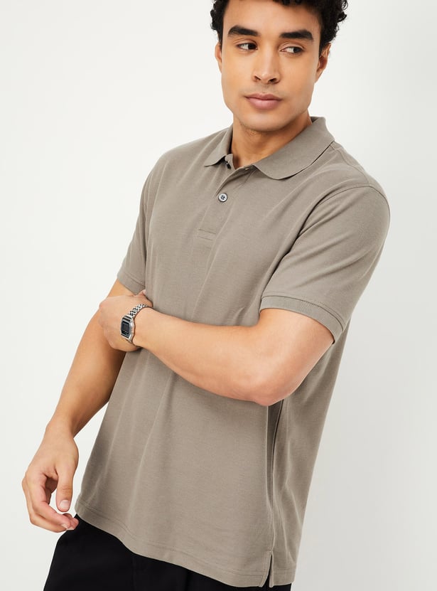 Step up your style with this regular-fit polo T-shirt, crafted in a solid tone for a sleek and versatile look. Designed with an even vented hem and half sleeves featuring ribbed trim, it ensures both comfort and sophistication. The classic polo collar adds a smart touch, making it perfect for effortless casual styling.