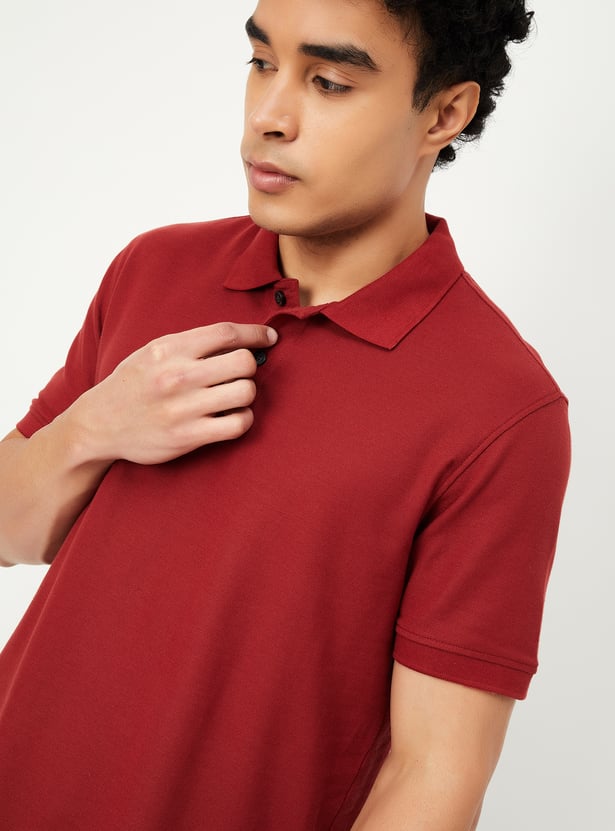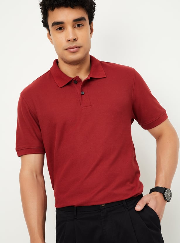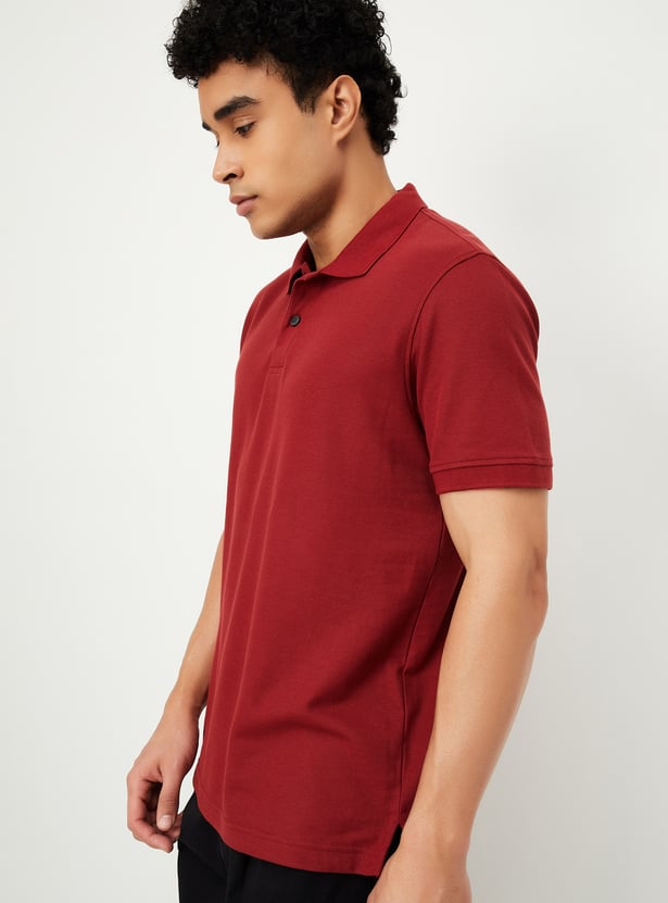 Step up your style with this regular-fit polo T-shirt, crafted in a solid tone for a sleek and versatile look. Designed with an even vented hem and half sleeves featuring ribbed trim, it ensures both comfort and sophistication. The classic polo collar adds a smart touch, making it perfect for effortless casual styling.