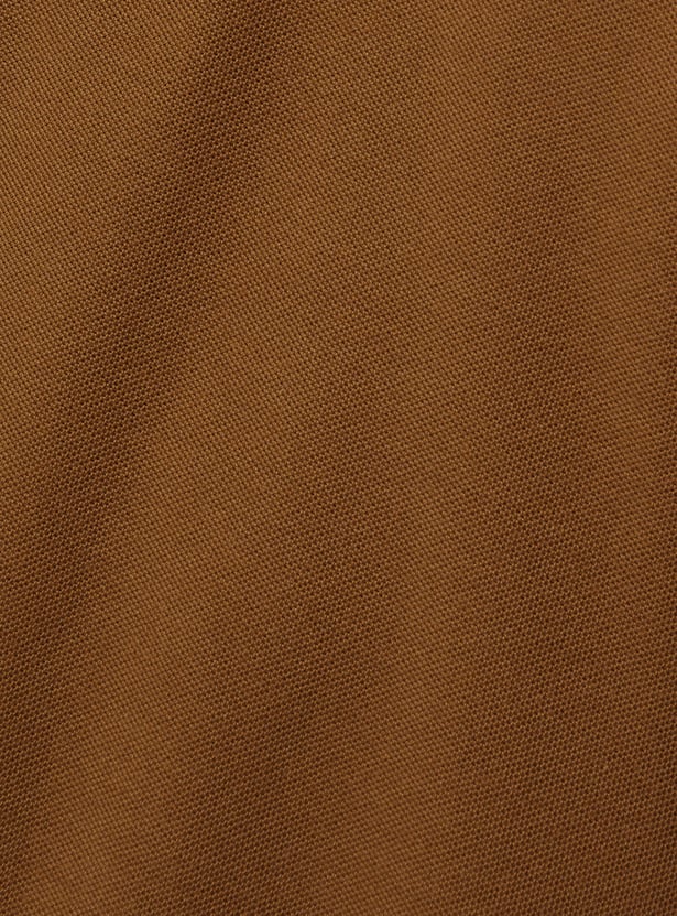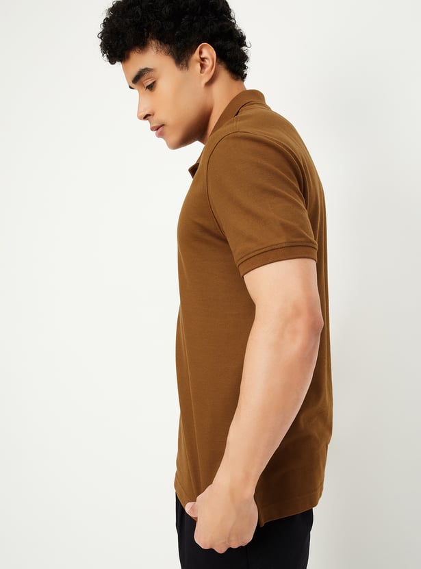Step up your style with this regular-fit polo T-shirt, crafted in a solid tone for a sleek and versatile look. Designed with an even vented hem and half sleeves featuring ribbed trim, it ensures both comfort and sophistication. The classic polo collar adds a smart touch, making it perfect for effortless casual styling.