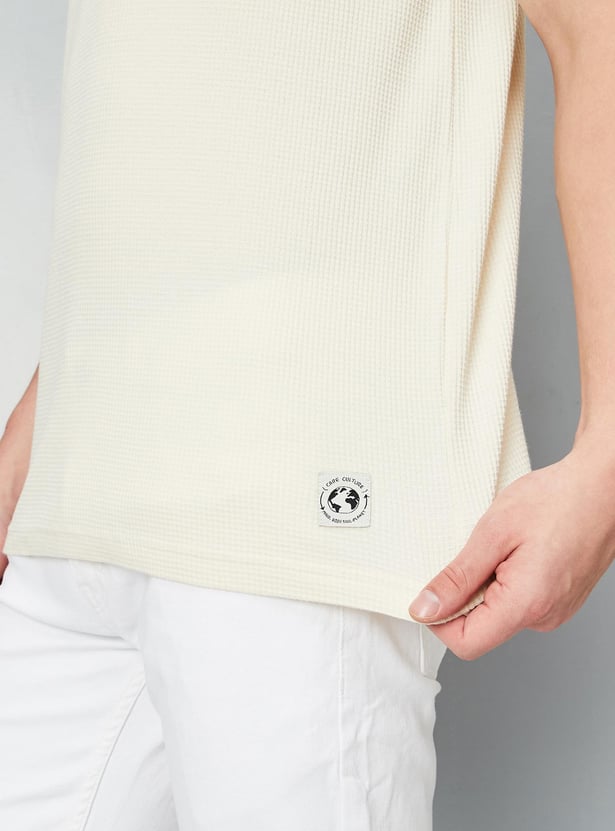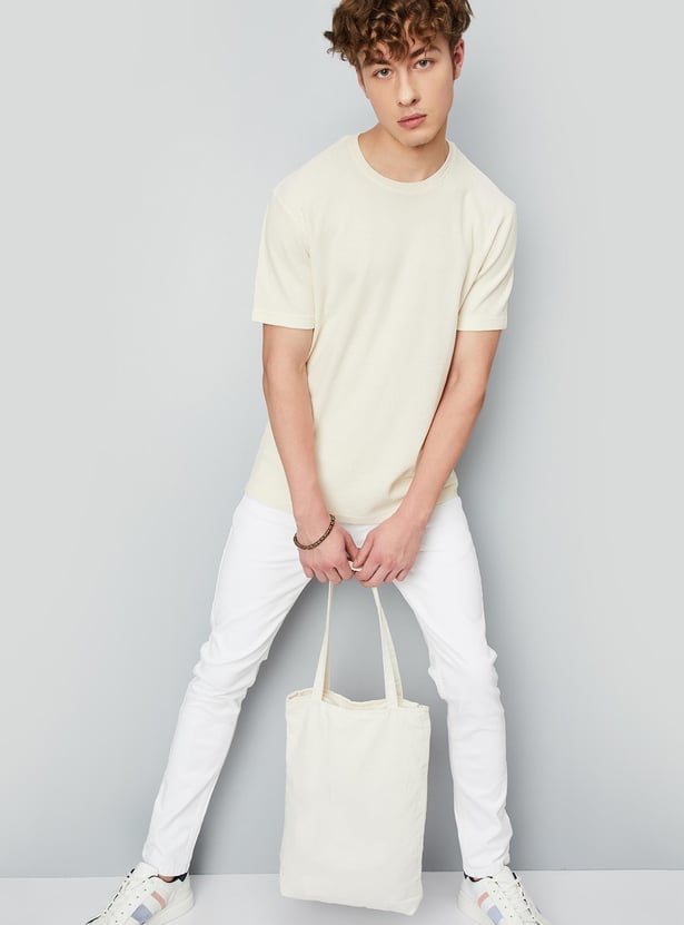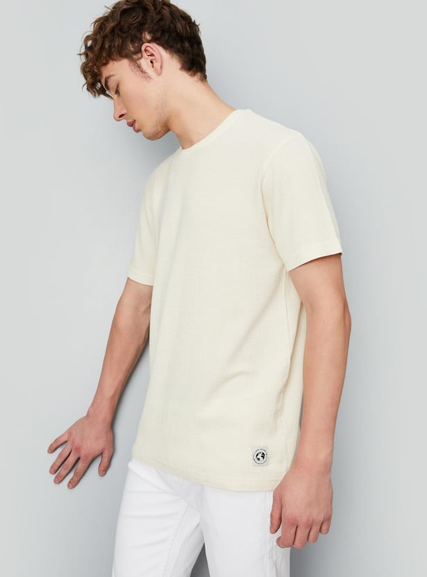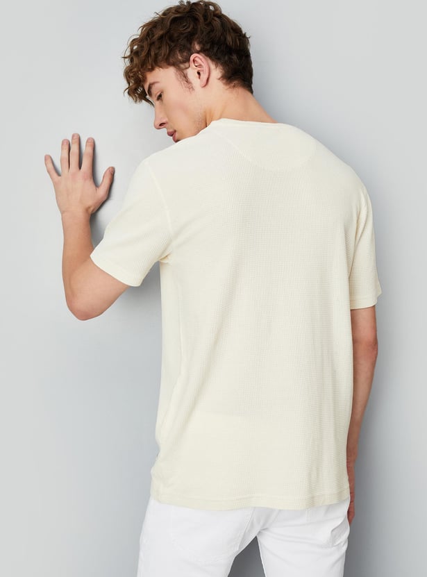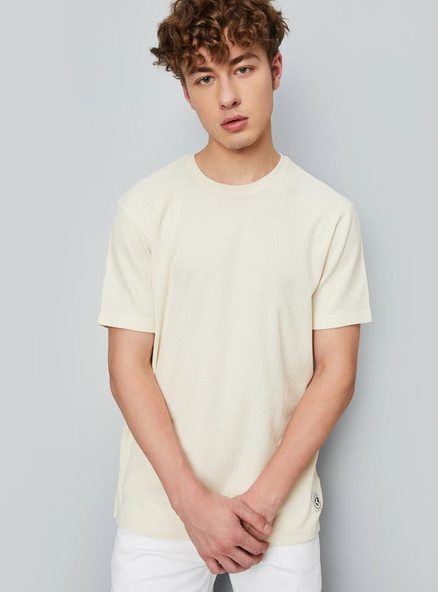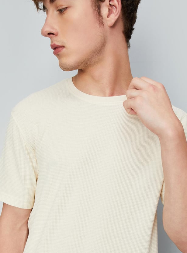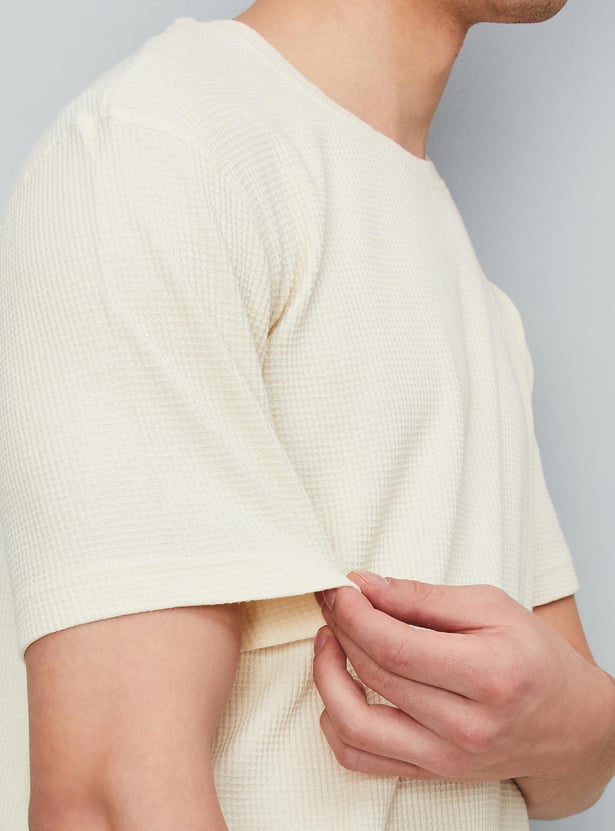 Up your style quotient with this textured T-shirt. This slim-fit profile features a crew neck and half sleeves. Team up this tee with a pair of jeans and sneakers to complete the look.