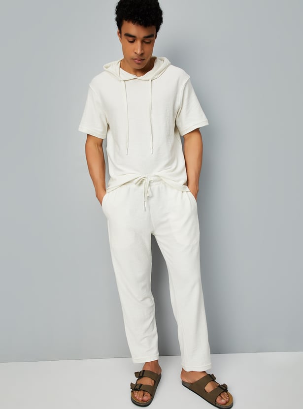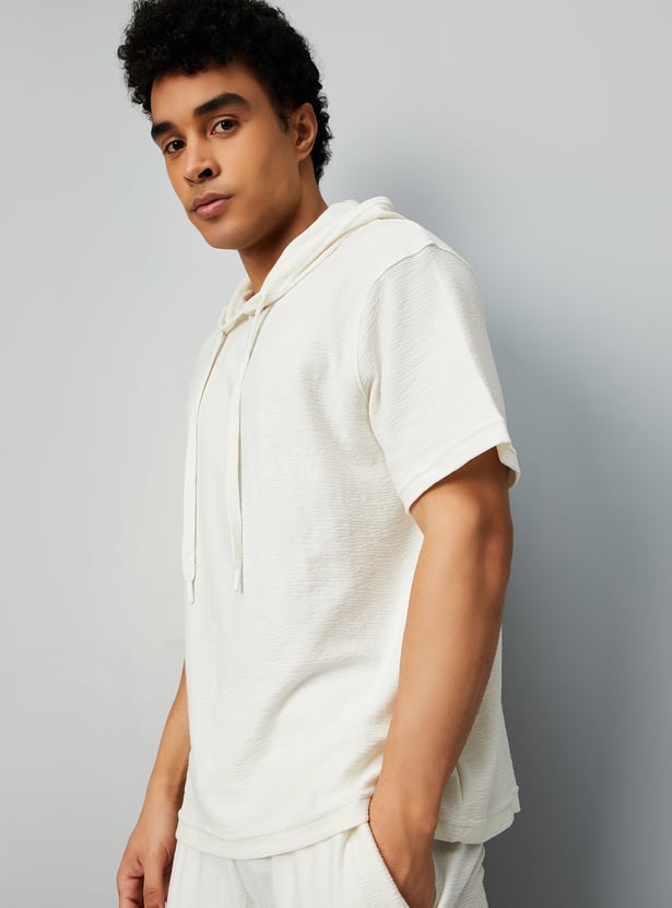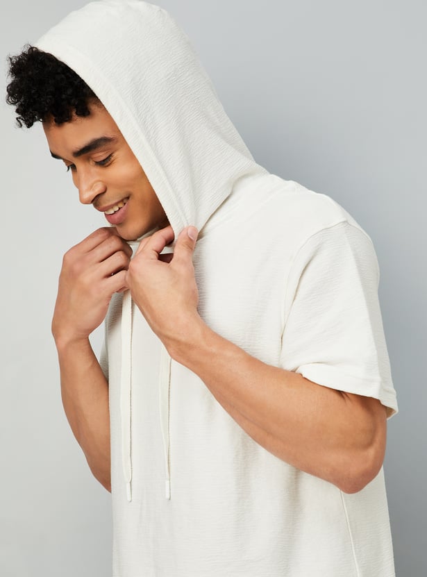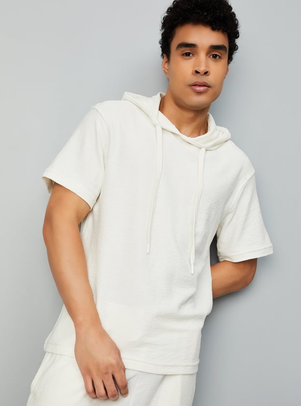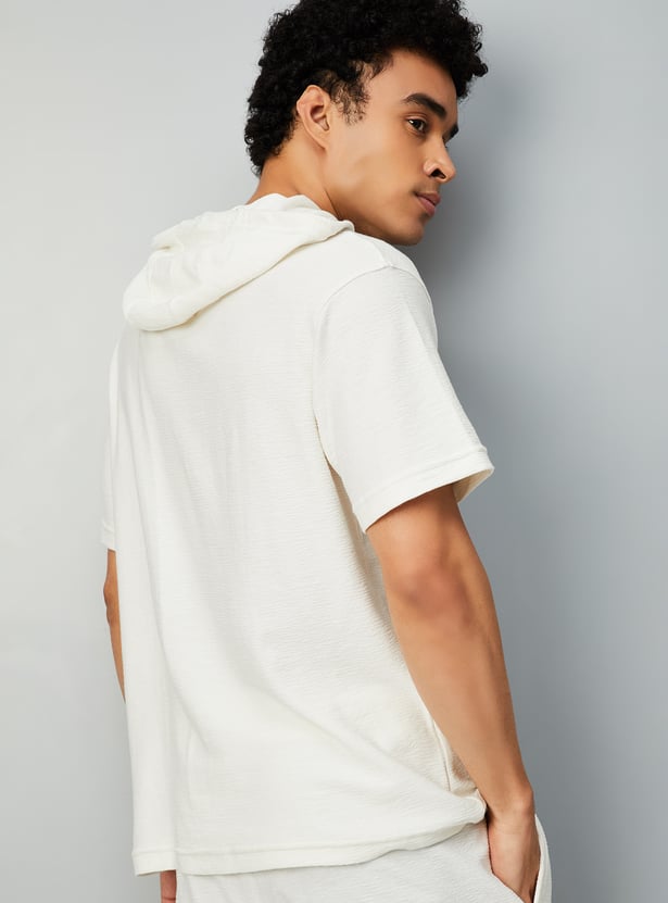 This textured t-shirt is a wardrobe essential, featuring a hooded neck and half sleeves for a comfortable, relaxed fit. Simple yet stylish, it’s perfect for everyday wear.