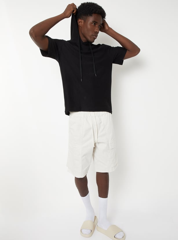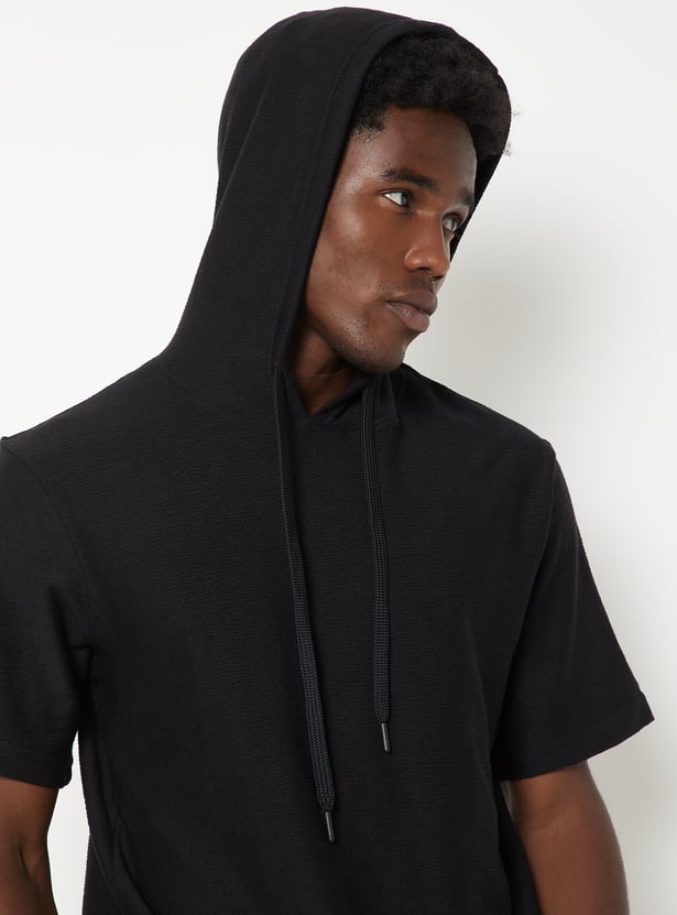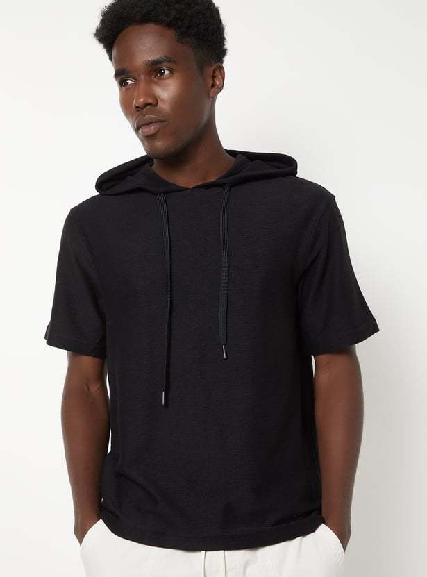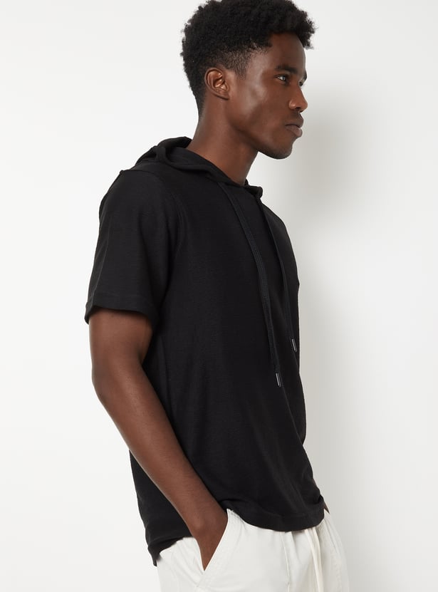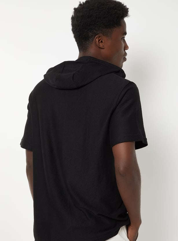 This textured t-shirt is a wardrobe essential, featuring a hooded neck and half sleeves for a comfortable, relaxed fit. Simple yet stylish, it’s perfect for everyday wear.