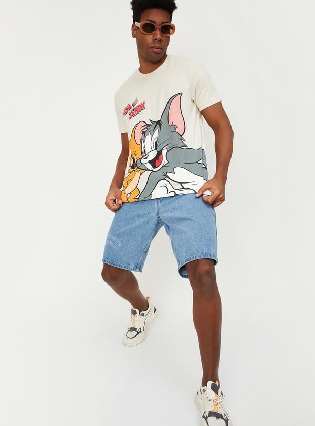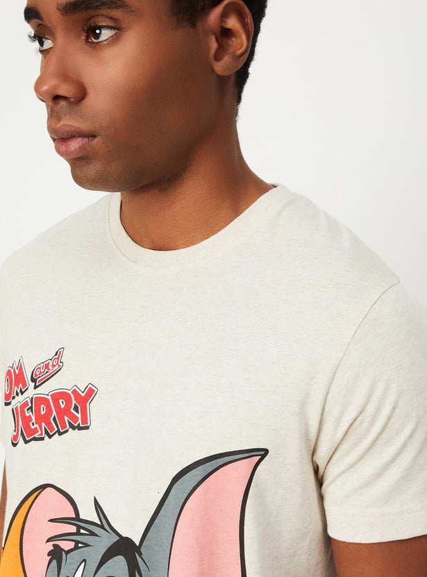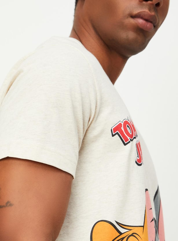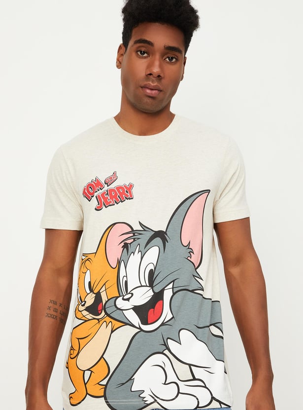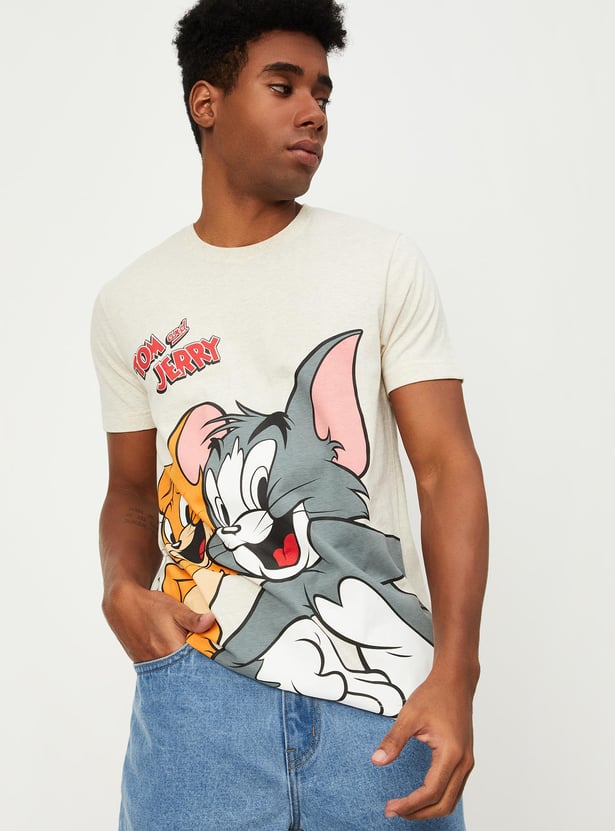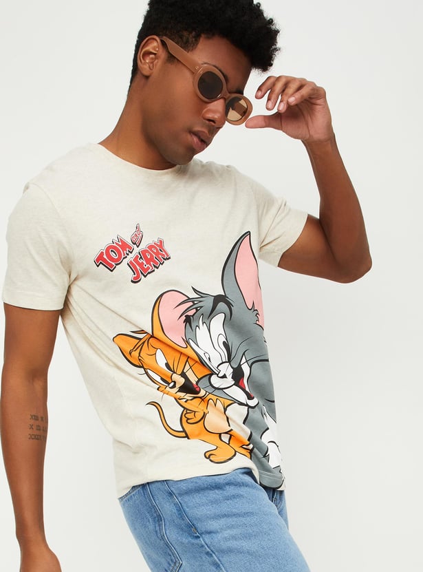 Show off your fandom with this slim-fit T-shirt. It has a crew neck, short sleeves, and Tom and Jerry graphic print on the front. Style this tee with a pair of denim shorts and sneakers to ace the style.