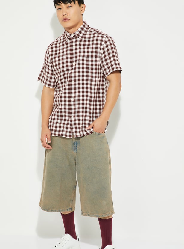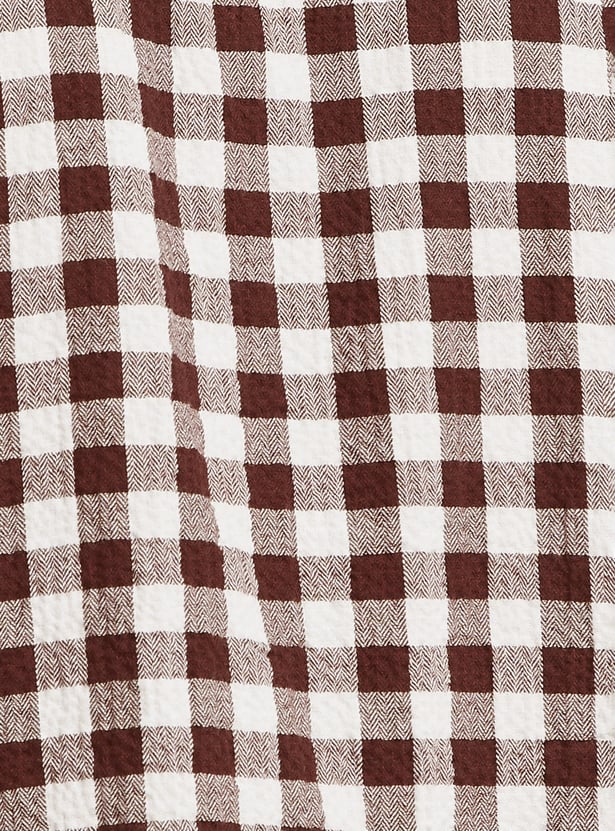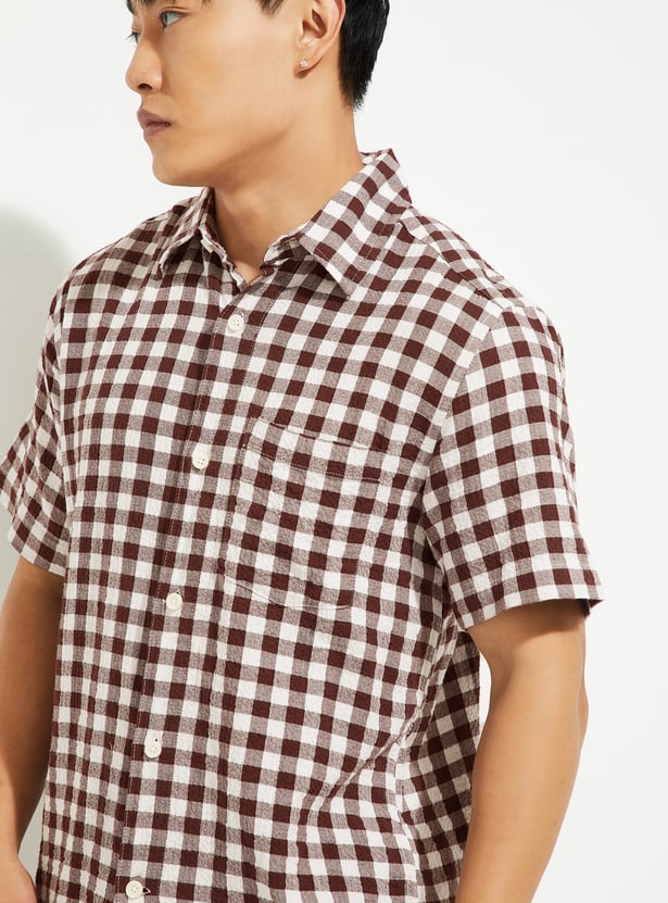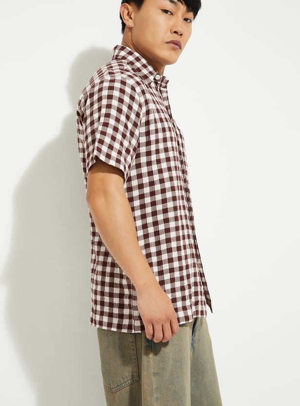 Add timeless charm to your wardrobe with this checked regular fit shirt. Featuring a spread collar, button placket, and half sleeves, it offers a smart yet casual appeal.