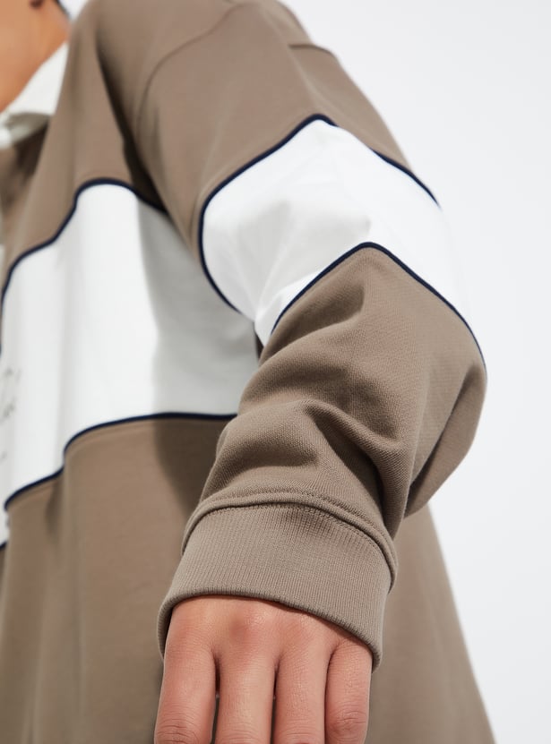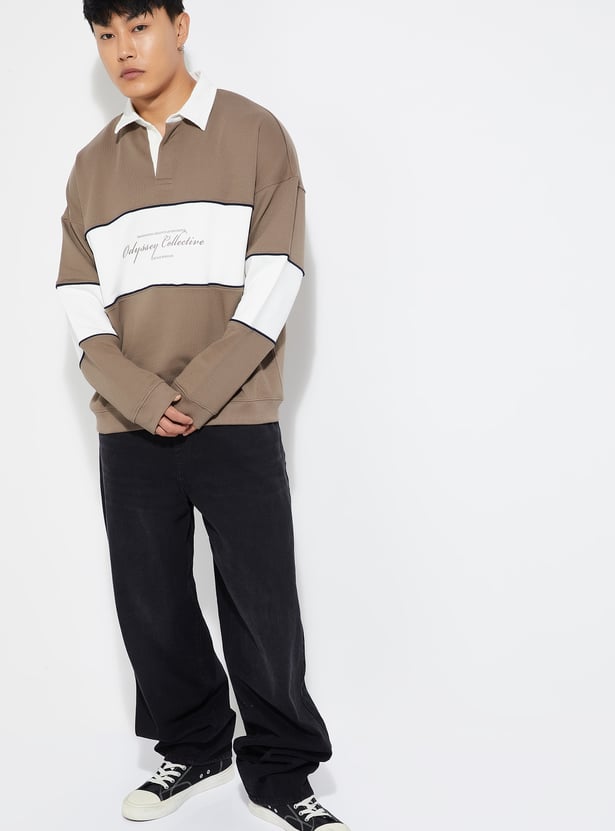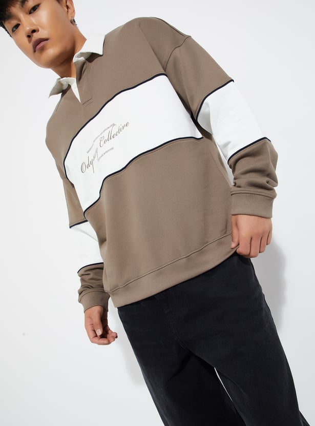 Add a sporty twist to your casual wear with this colourblock oversized sweatshirt, featuring a spread collar and full sleeves for a stylish yet comfortable look.