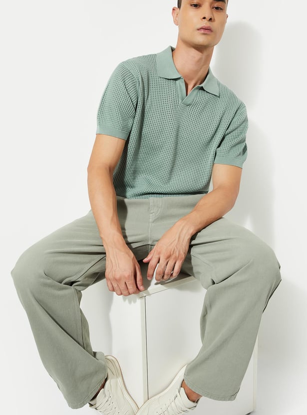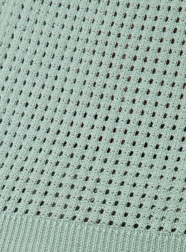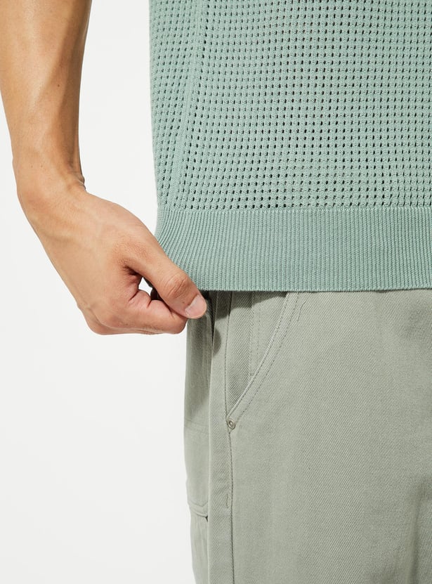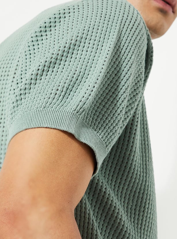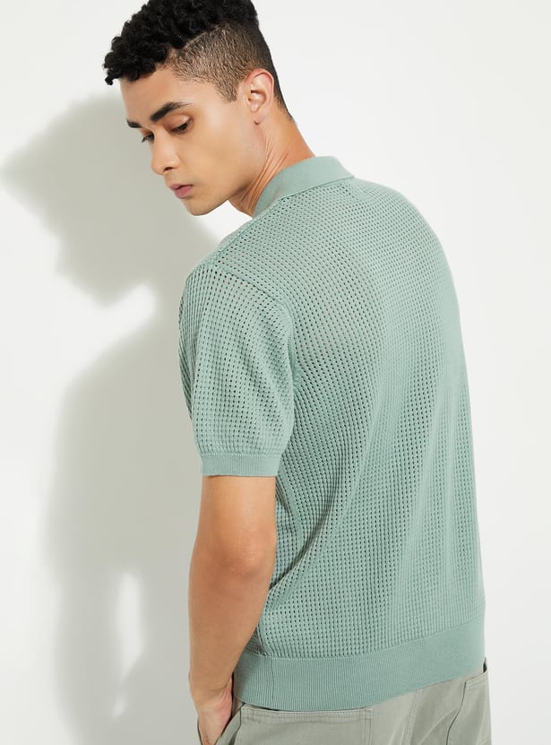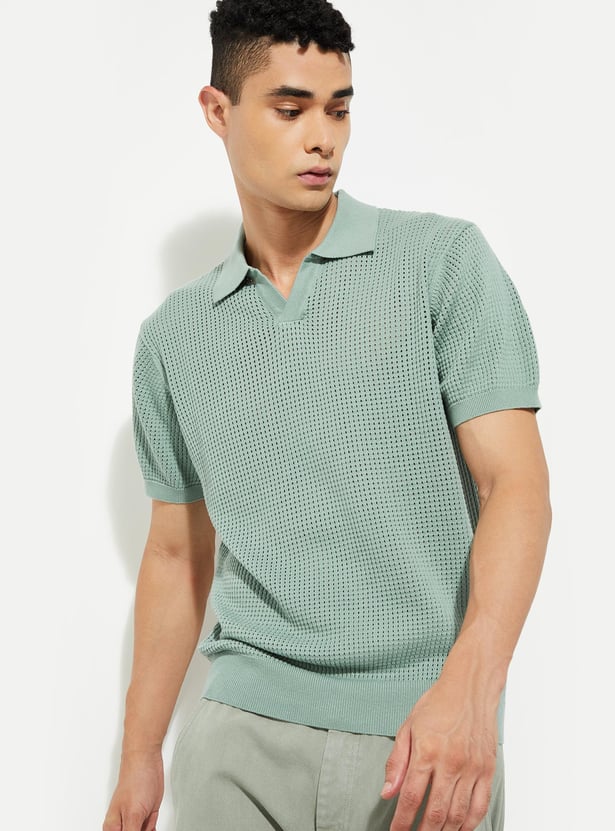 The cool style and effortless comfort of this T-shirt make it a staple this summer. It features an open-knit design with a ribbed trim for added style. This tee has a polo collar and half sleeves.