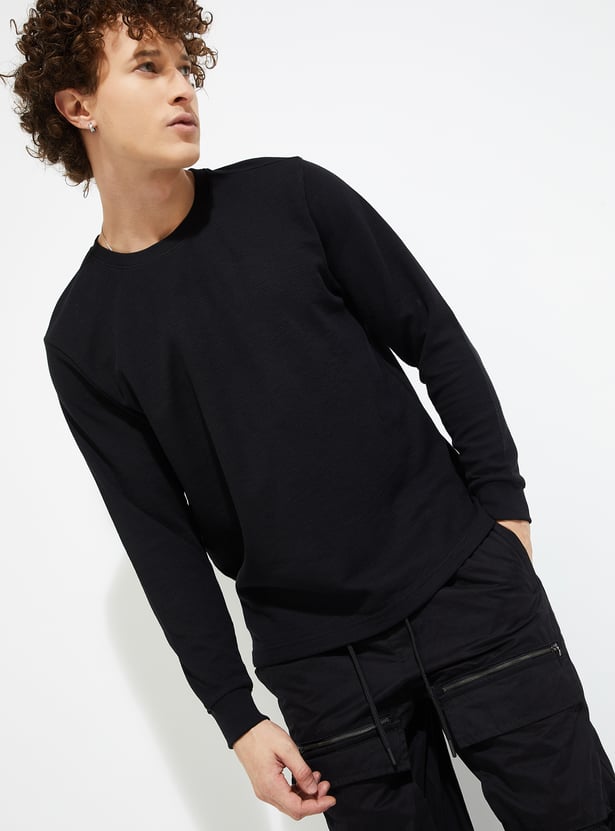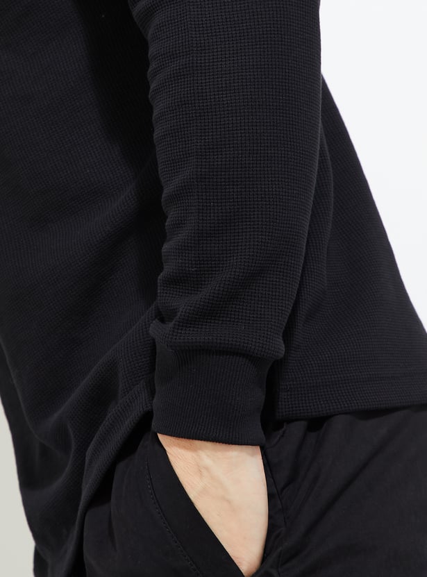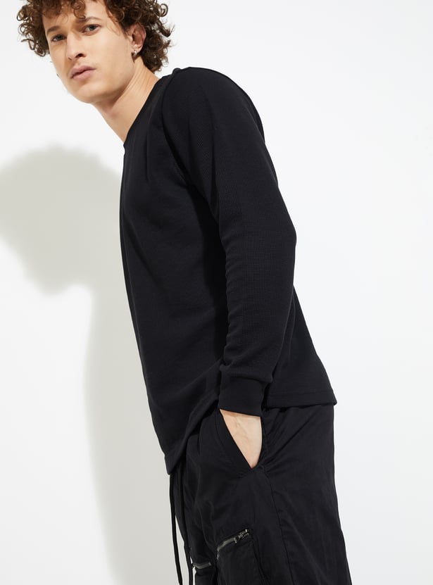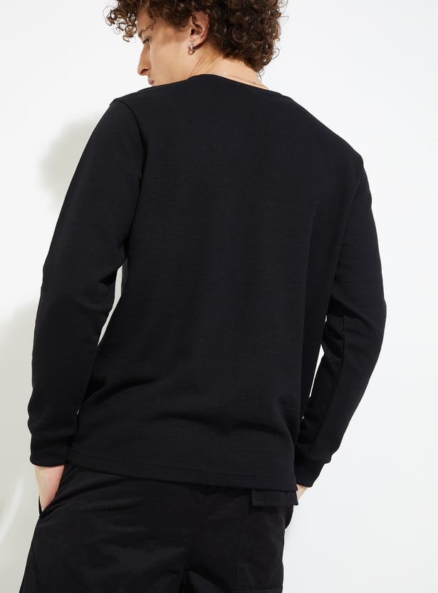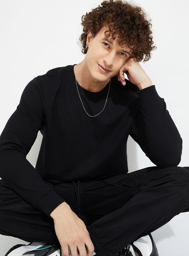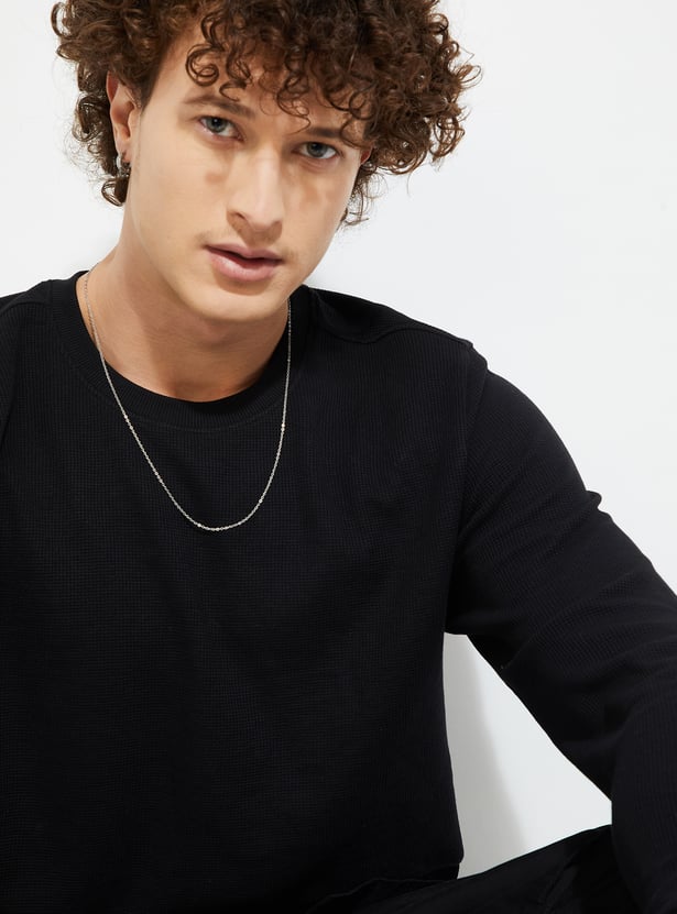 Stay warm and stylish in this T-shirt. The knit pattern lends a cosy touch. It has a crew neck and full sleeves with a classic look.