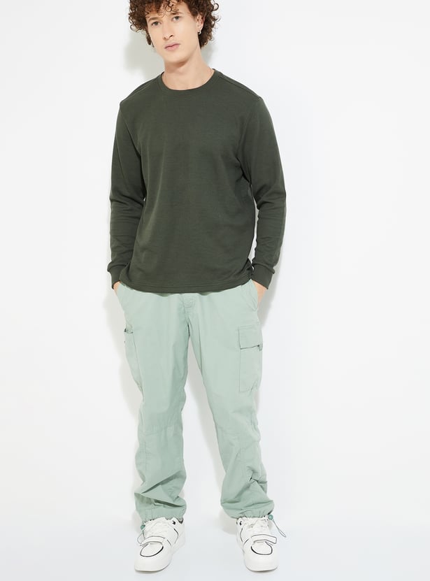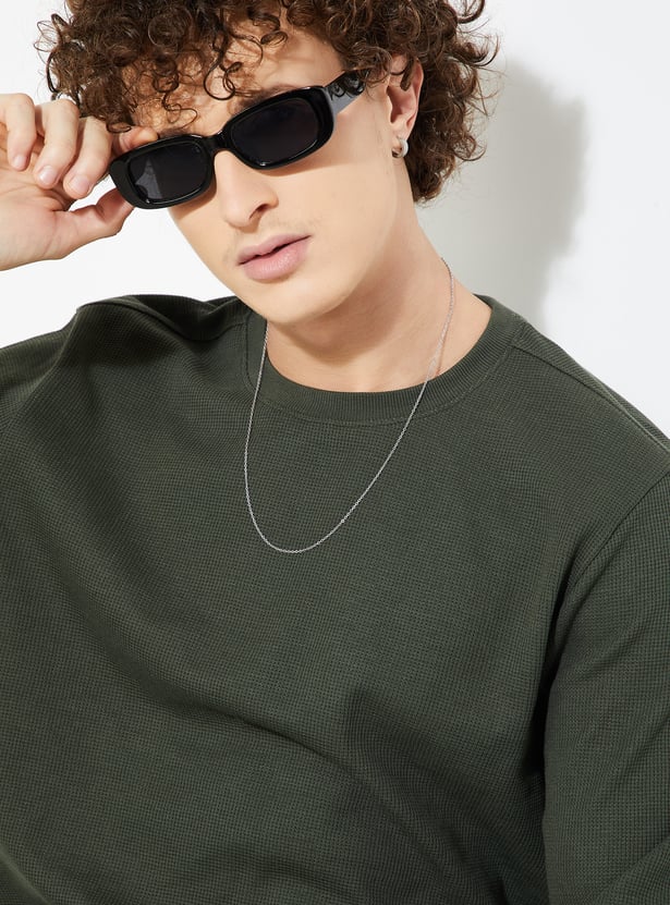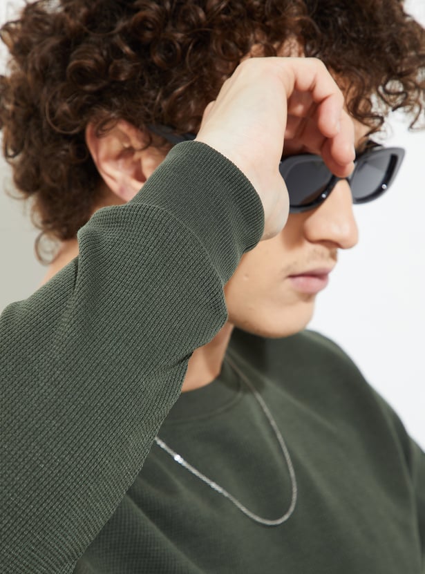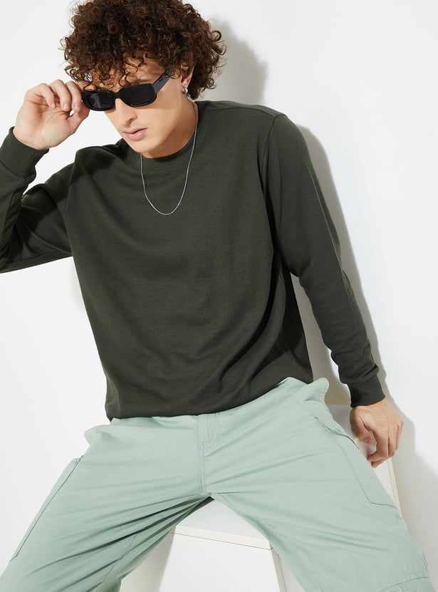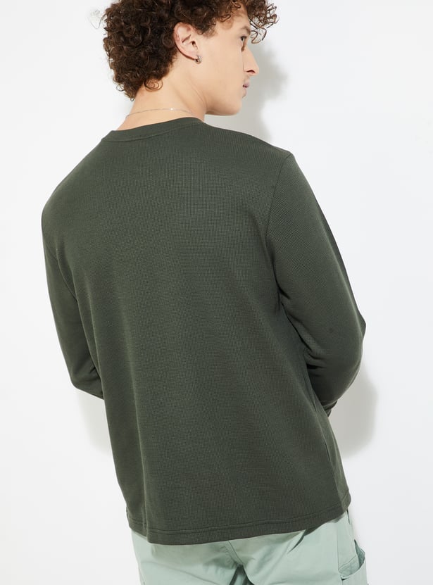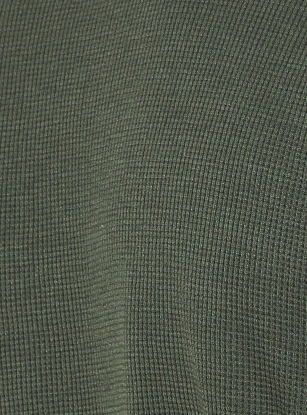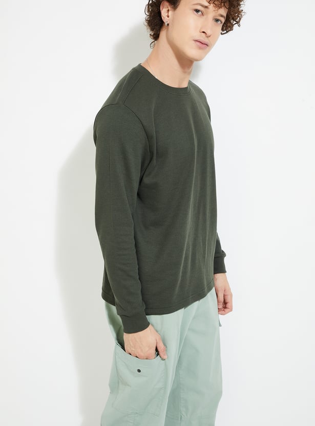 Stay warm and stylish in this T-shirt. The knit pattern lends a cosy touch. It has a crew neck and full sleeves with a classic look.