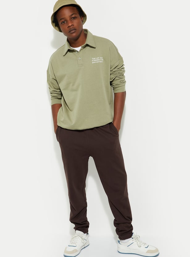 Level up your streetwear game with this oversized sweatshirt featuring an embroidered design at the back. Its full sleeves, polo collar, and ribbed hem exude urban style, making it a standout piece in your wardrobe.