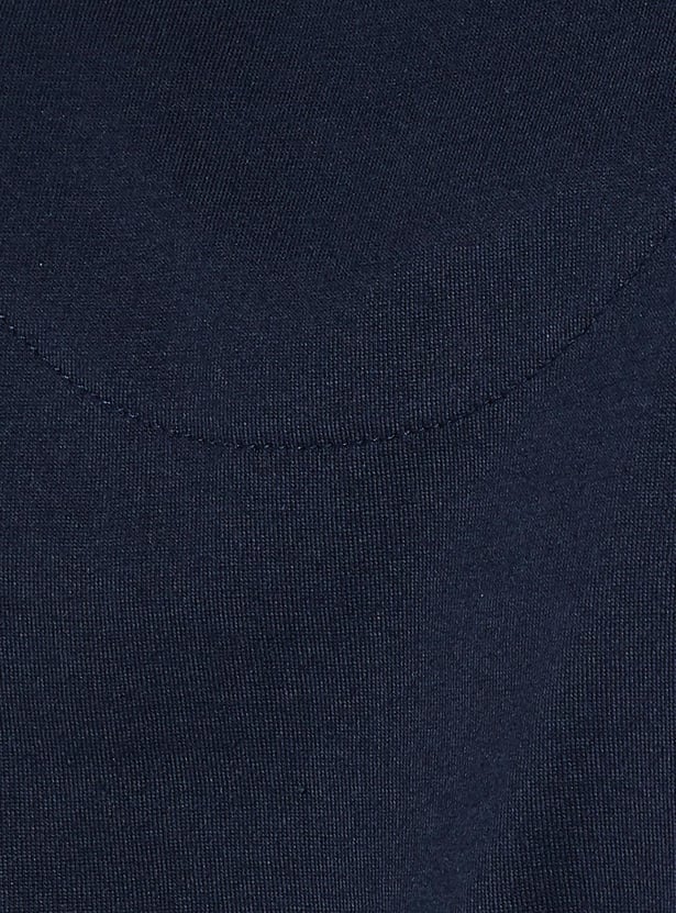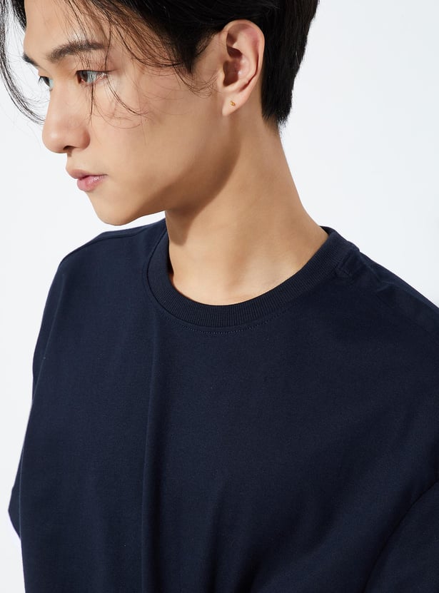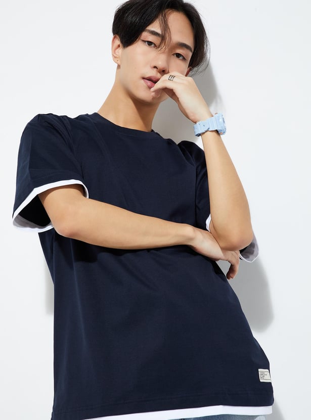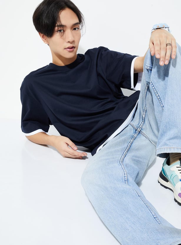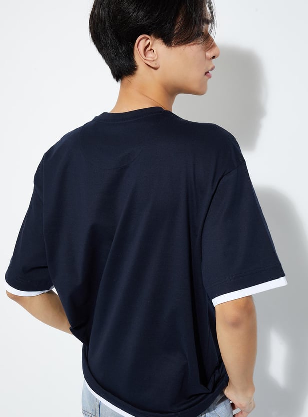 Elevate your casual wardrobe with this solid-finish T-shirt. It is designed with a classic crew neck, short sleeves, and an oversized profile. The faux layered trim elevates the style.