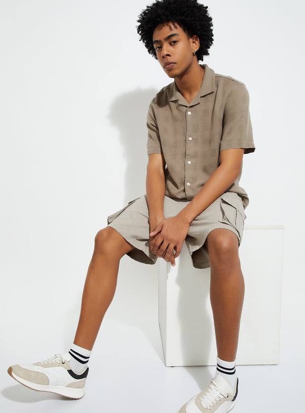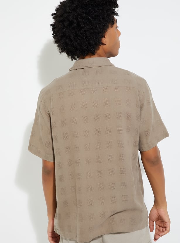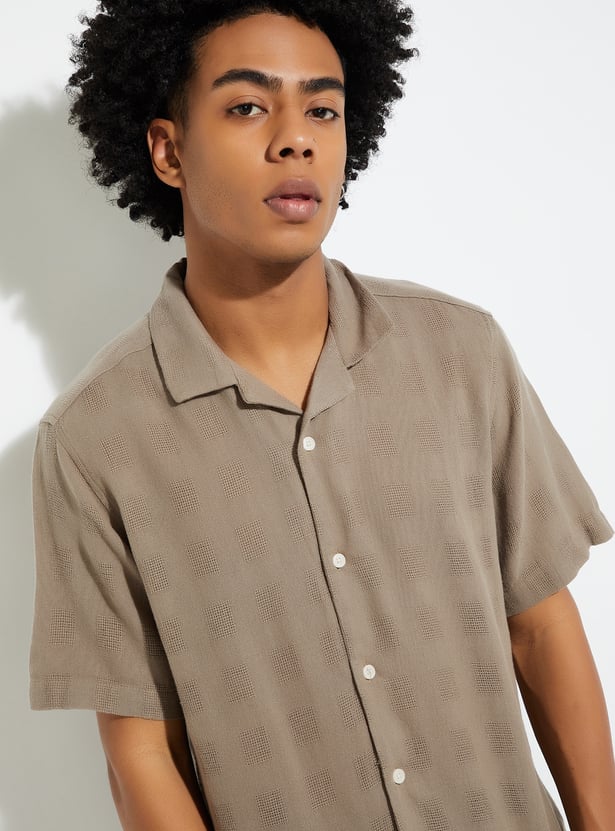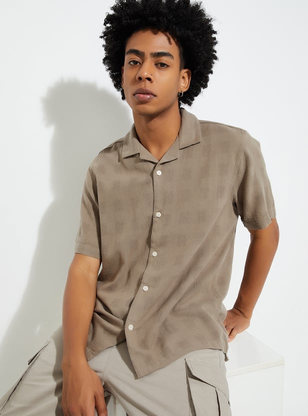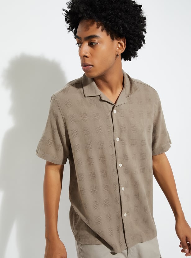 Add a touch of relaxed style to your wardrobe with this knit oversized-fit shirt. Featuring a resort collar, button placket, and half sleeves, it offers both comfort and a laid-back vibe. The knit gives it a unique edge, making it a versatile addition to any casual outfit.