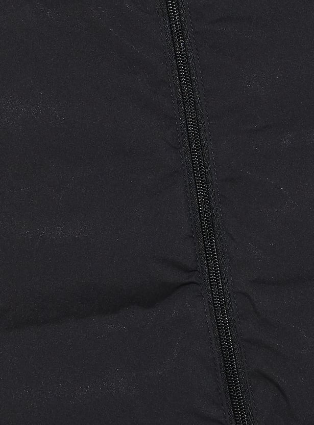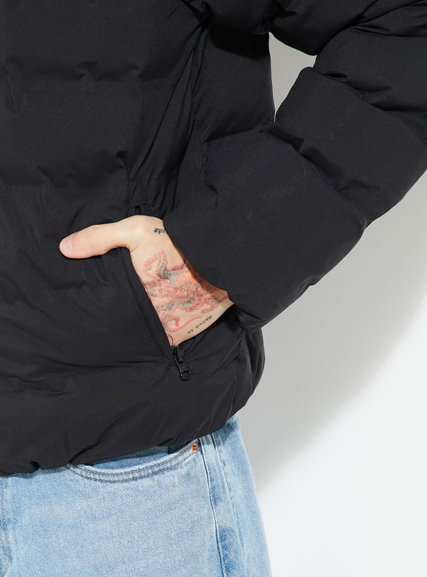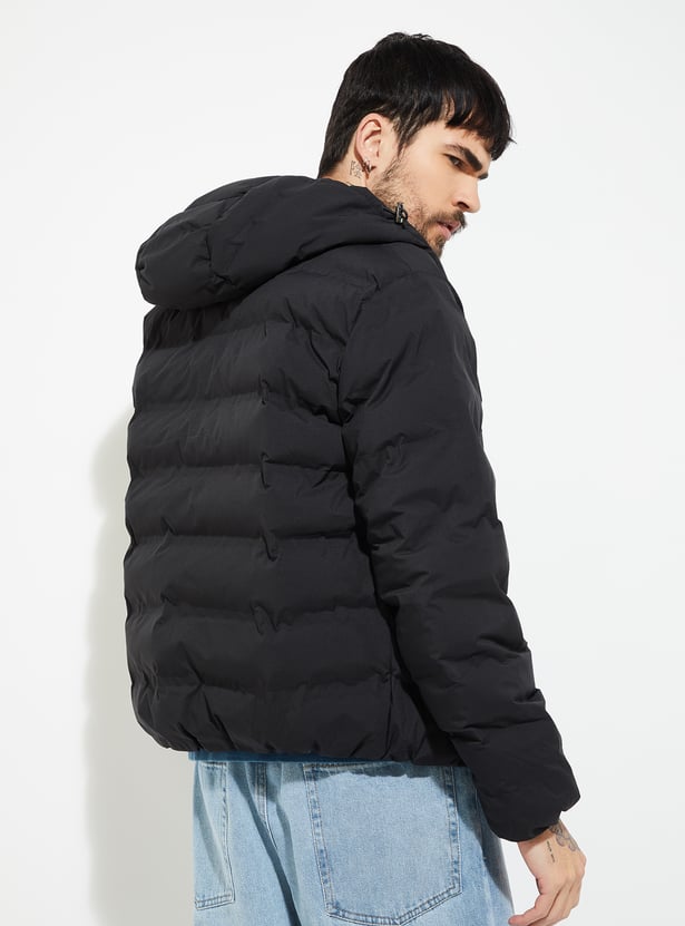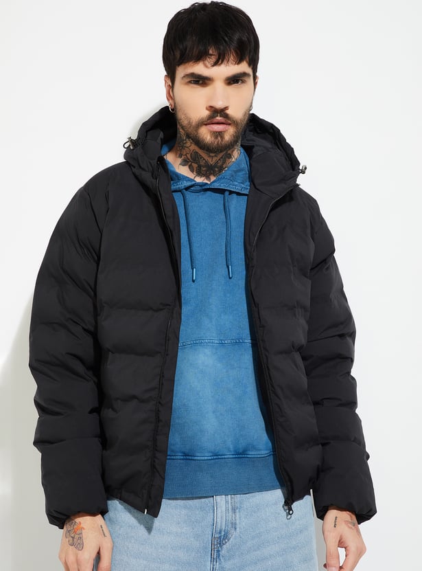 Stay warm in style with this puffer hooded jacket, featuring a secure zip closure, adjustable drawcord hood, and full sleeves. Side pockets add functionality, making it a versatile layer for chilly days.