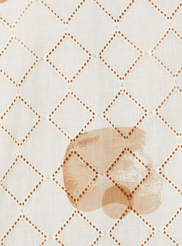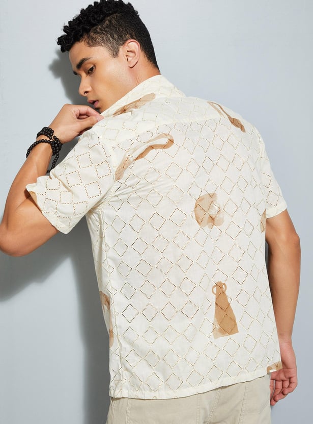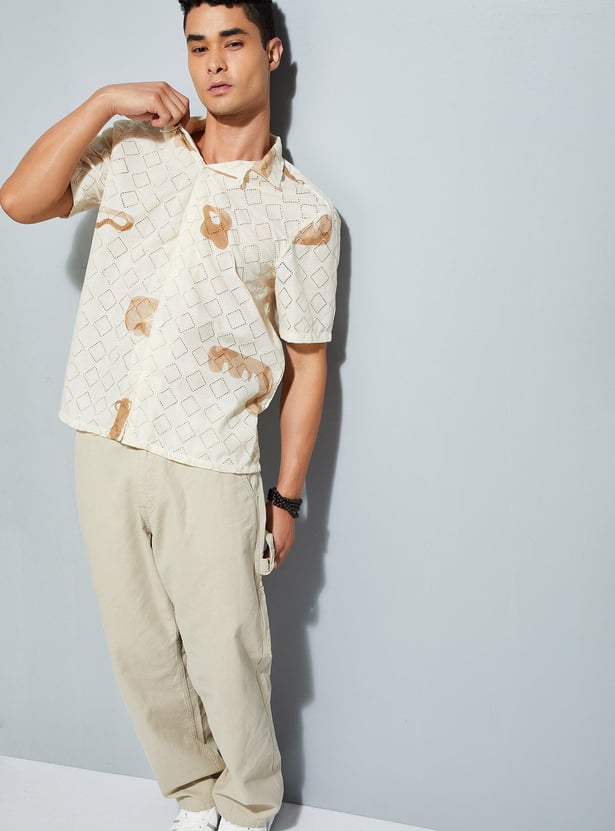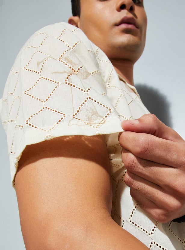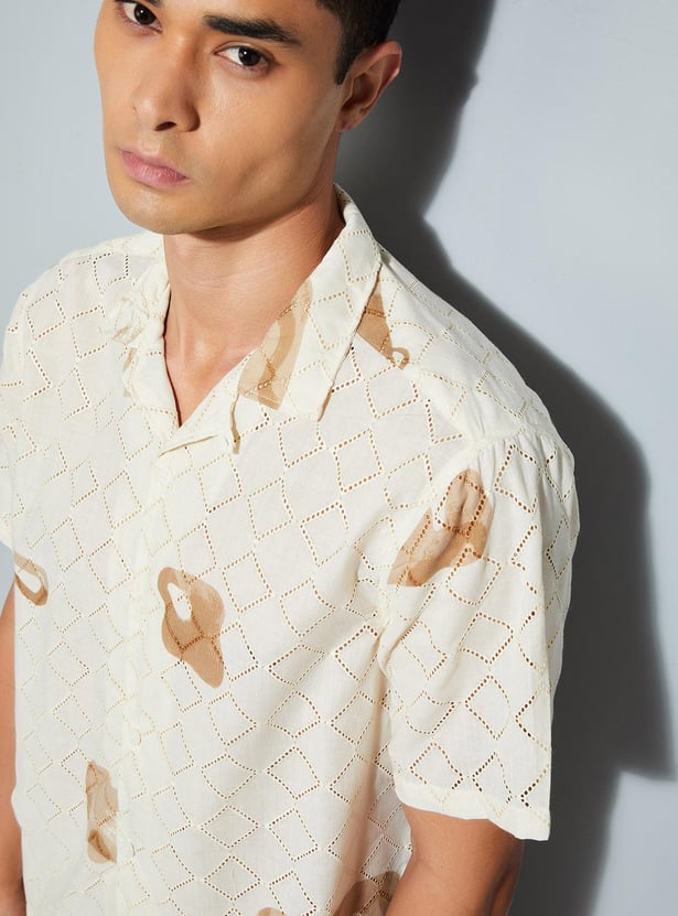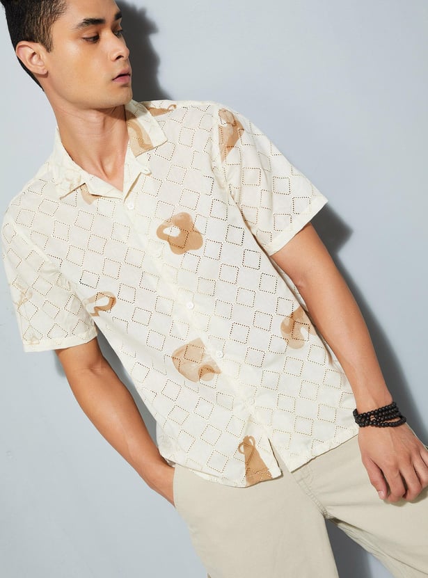 Elevate your casual style with this schiffli shirt, featuring a printed surface for added flair. With its resort collar, short sleeves, and straight hem, it brings sophistication to your laid-back look.