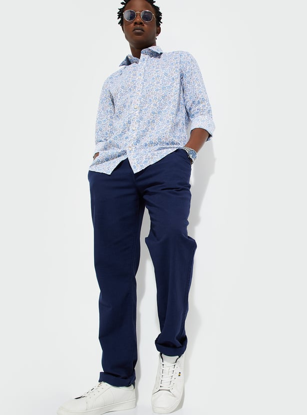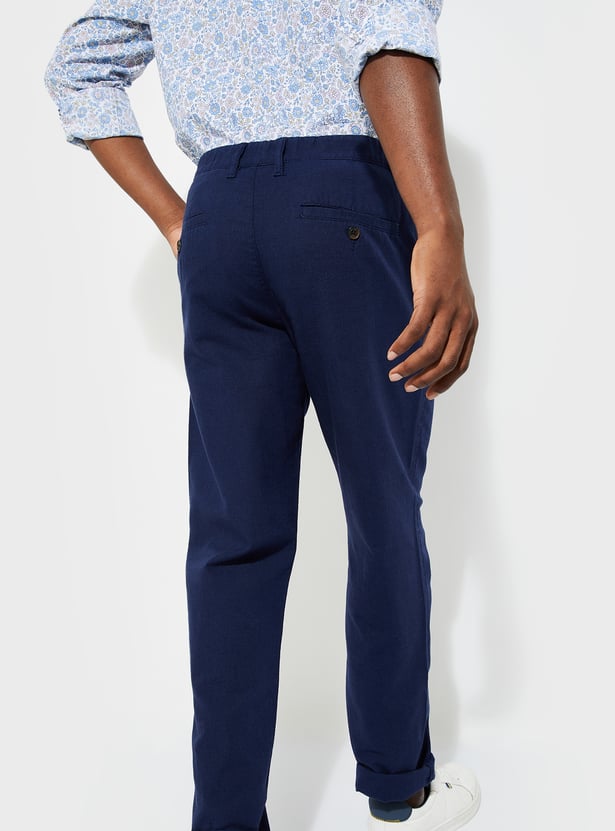 Elevate your casual ensemble with these straight-fit trousers, featuring four pockets, waist loops, and a button closure.