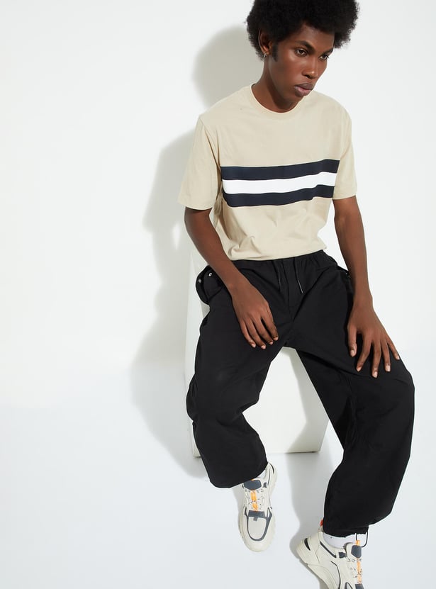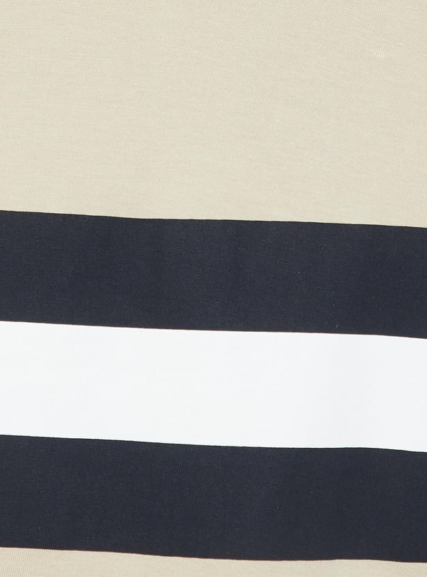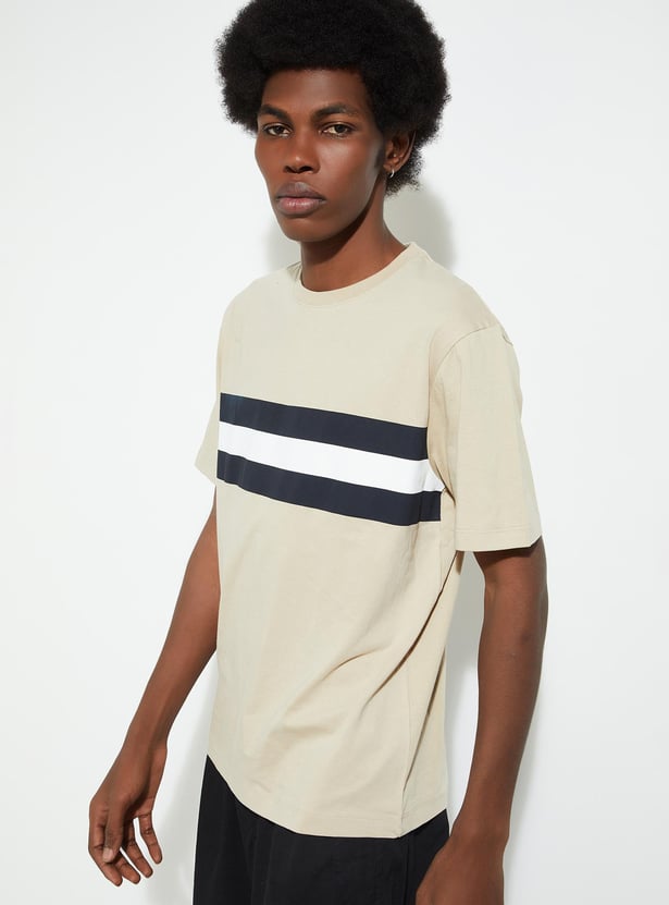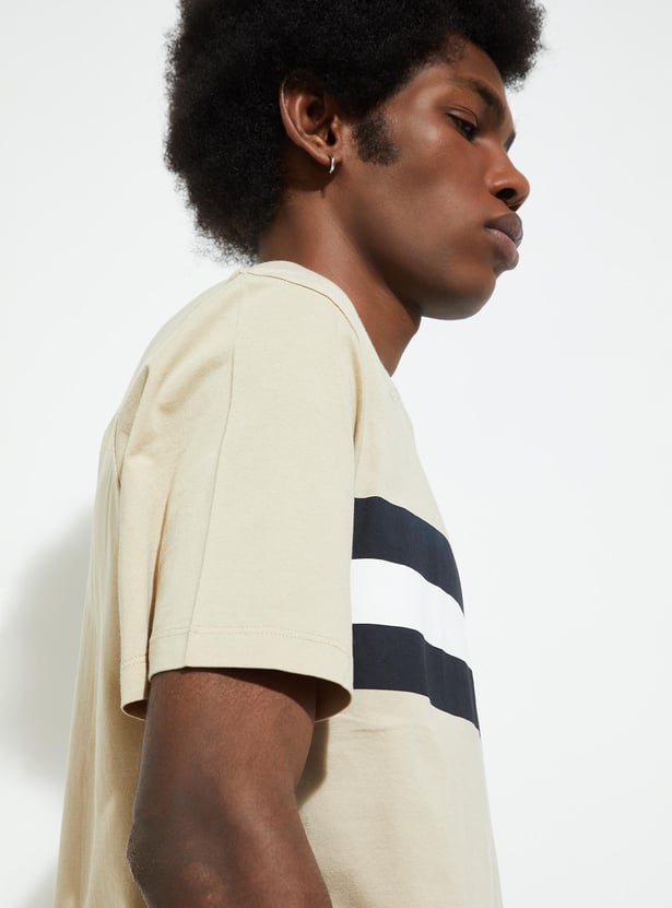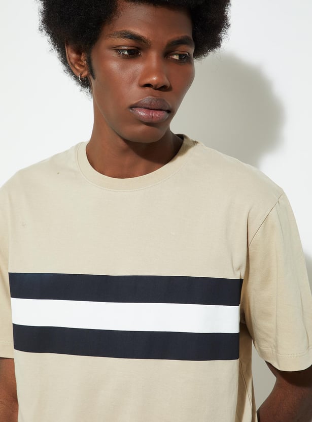 Infuse comfort and style into your wardrobe with this T-shirt featuring a trendy striped pattern, half sleeves, and a classic crew neck.