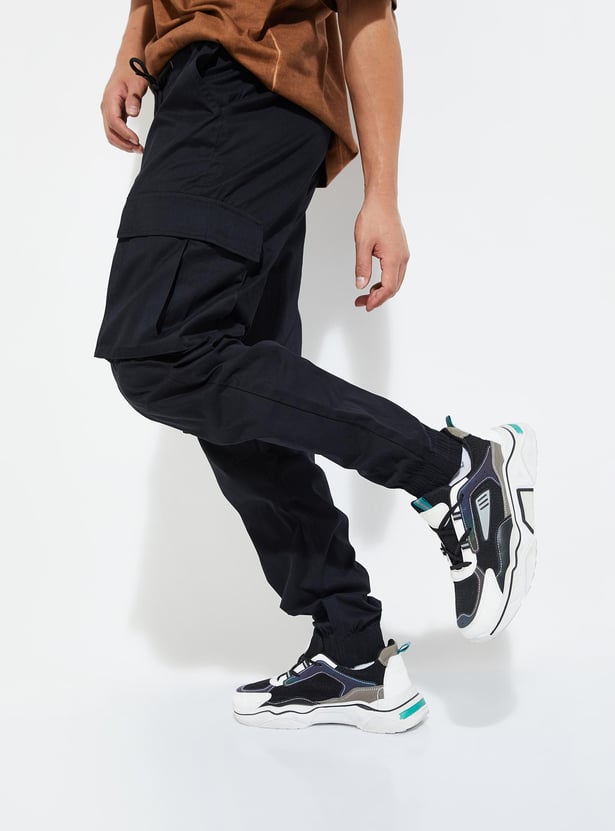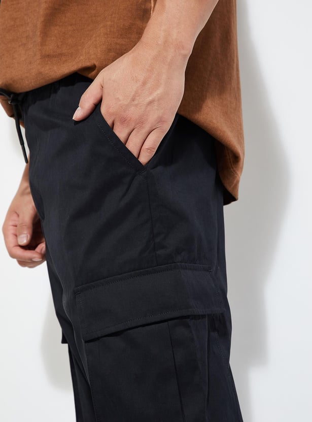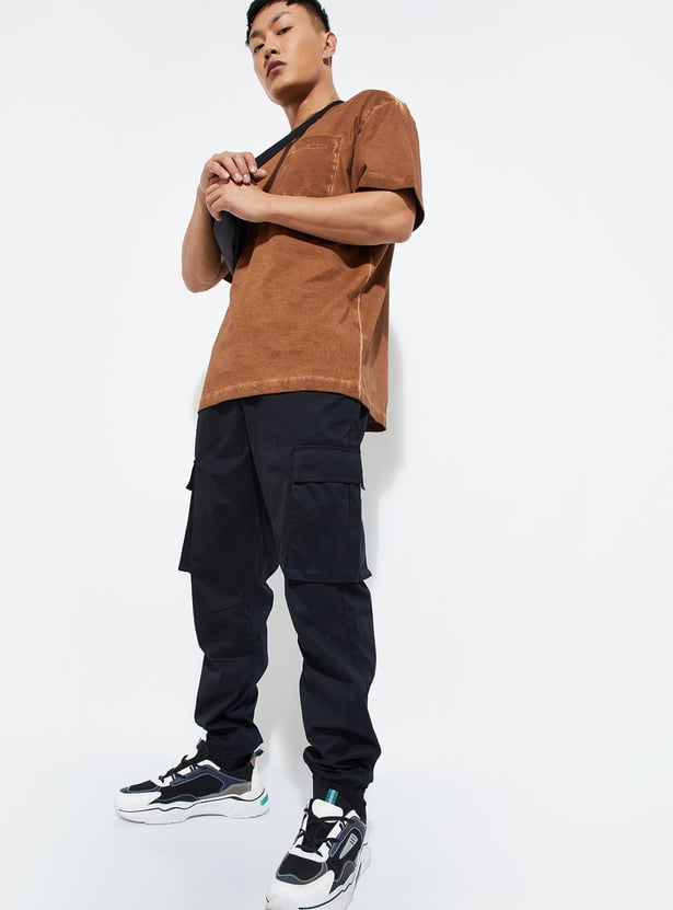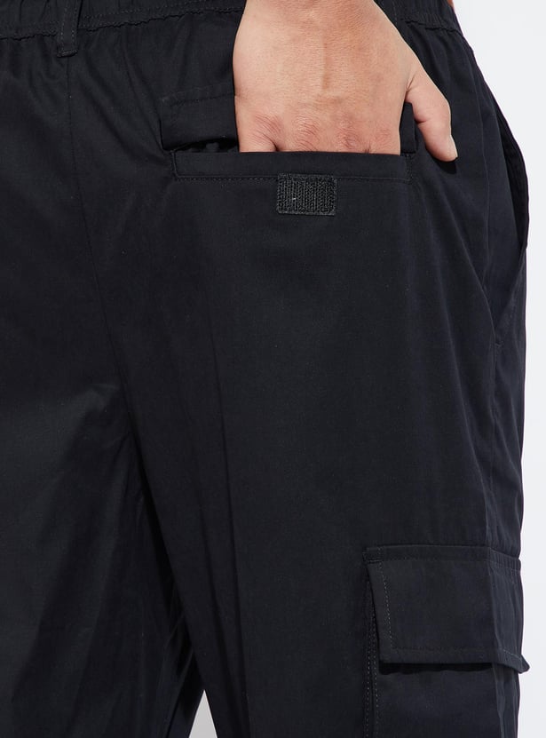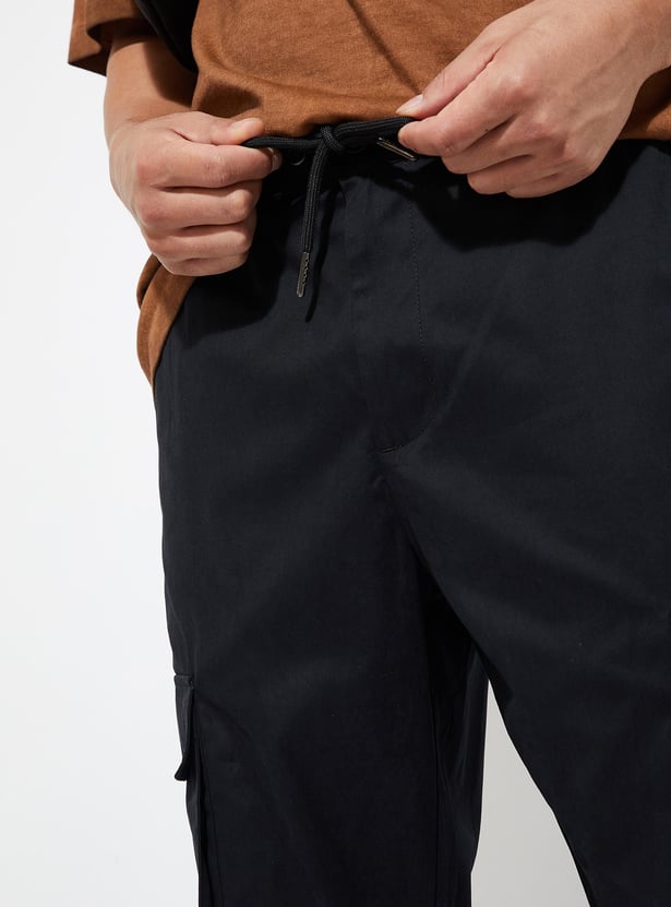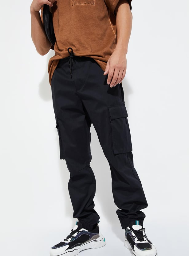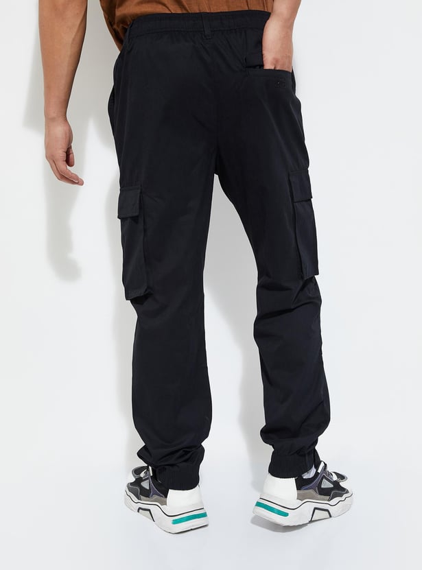 Boost your urban style game with these sleek joggers, crafted in a versatile solid tone. Sporting a drawstring waist, zipped side pockets, cargo pockets, a back pocket, and cuffed hems, they blend functionality with street-ready flair.