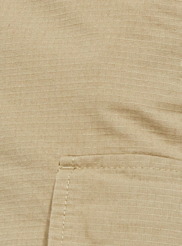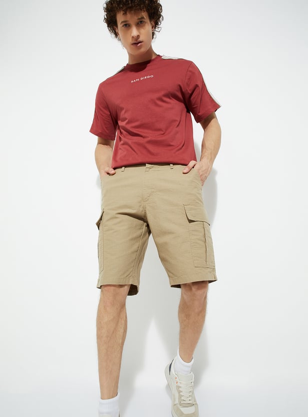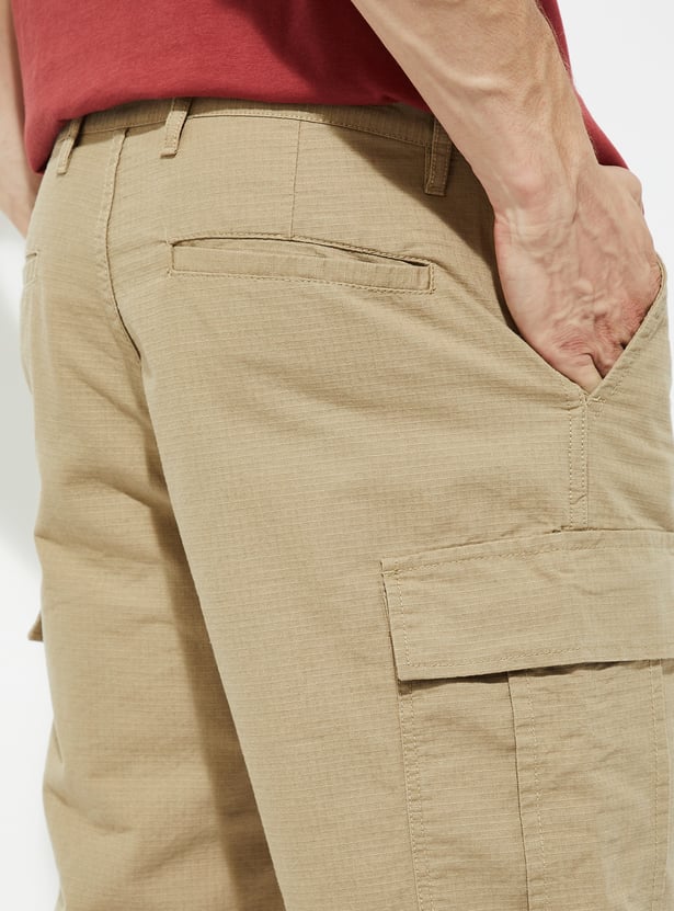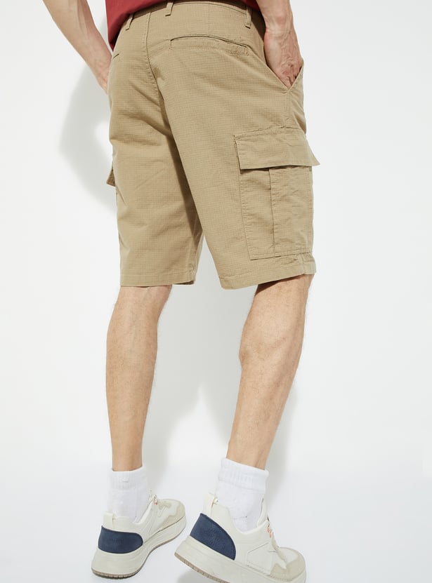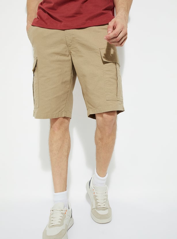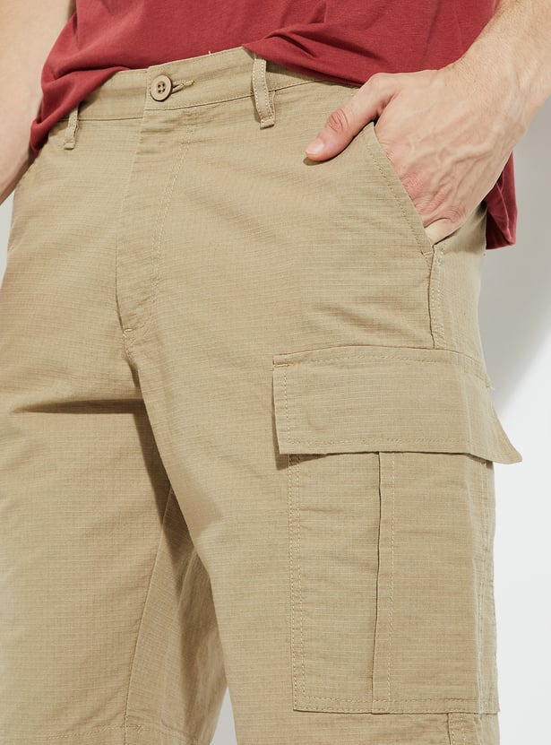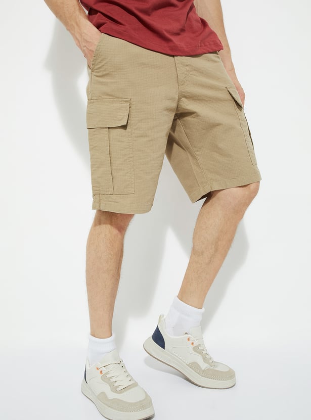 Play bold with these cargo shorts that are loaded with a solid surface. Designed with a button closure and statement utility pockets. These shorts ensure maximum comfort and score well during weekend outings.