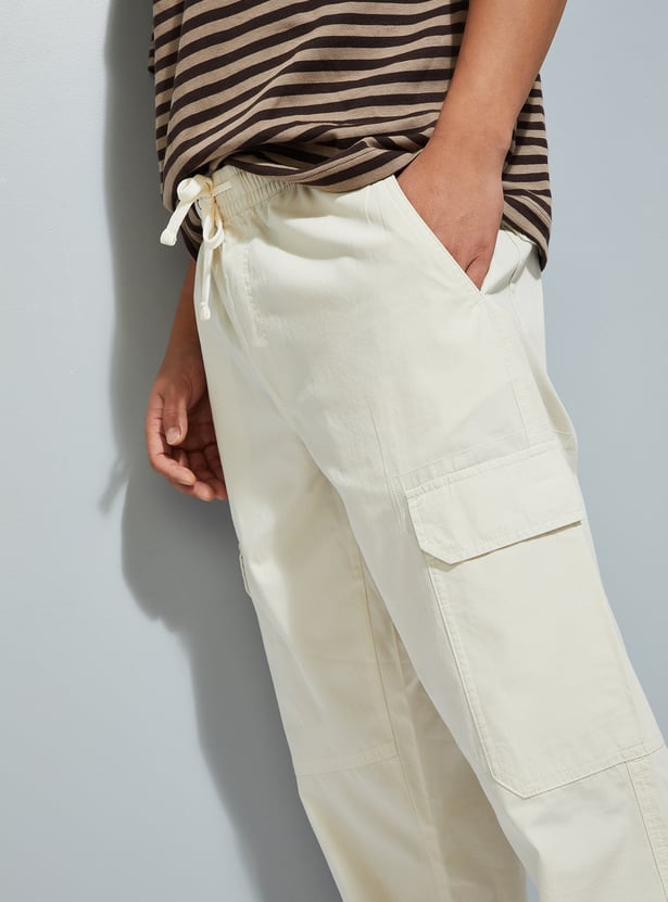 These solid cargos feature a mid-rise, classic cargo pockets, and a drawstring closure, blending utility with everyday comfort. Made from durable fabric, they’re designed for versatility, offering both style and practicality for casual wear.