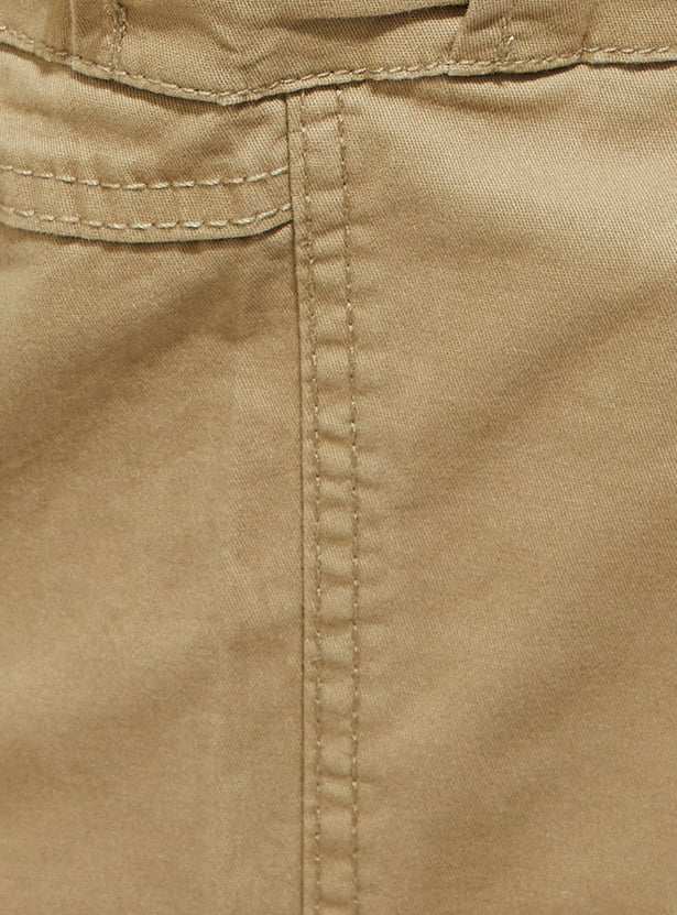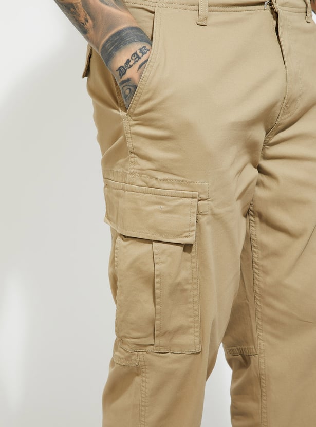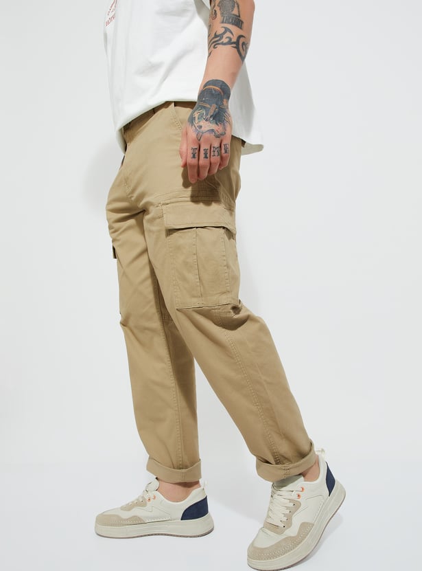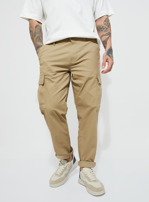 Step into casual comfort with these solid relaxed fit cargo trousers, designed with a mid-rise waist, button closure, and roomy pockets for utility style.