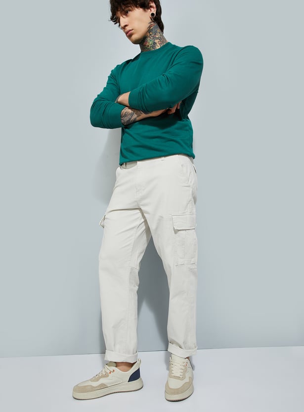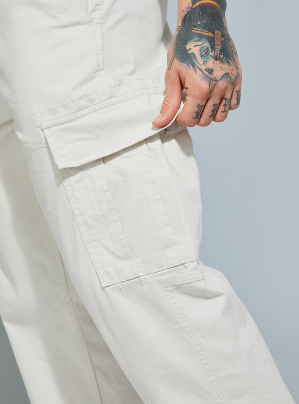 Step into casual comfort with these solid relaxed fit cargo trousers, designed with a mid-rise waist, button closure, and roomy pockets for utility style.