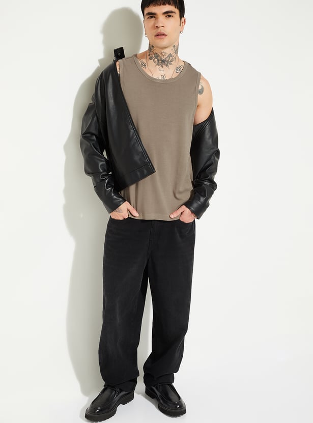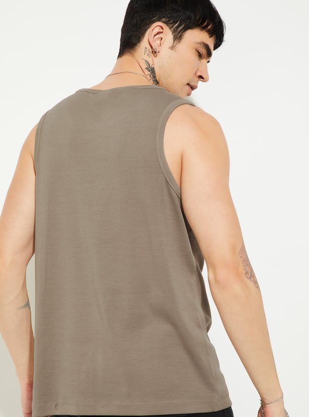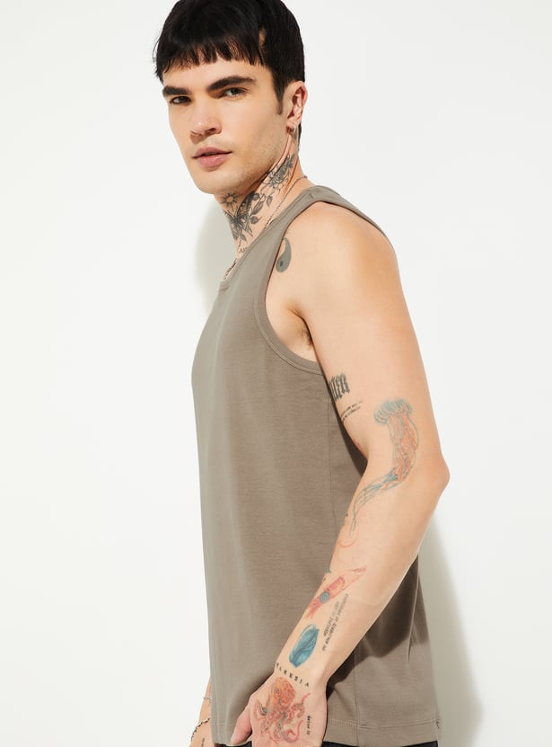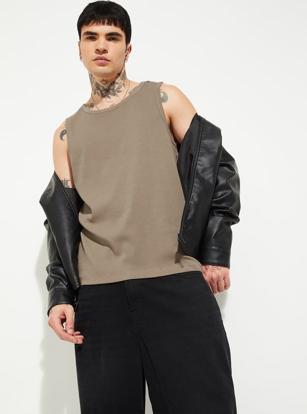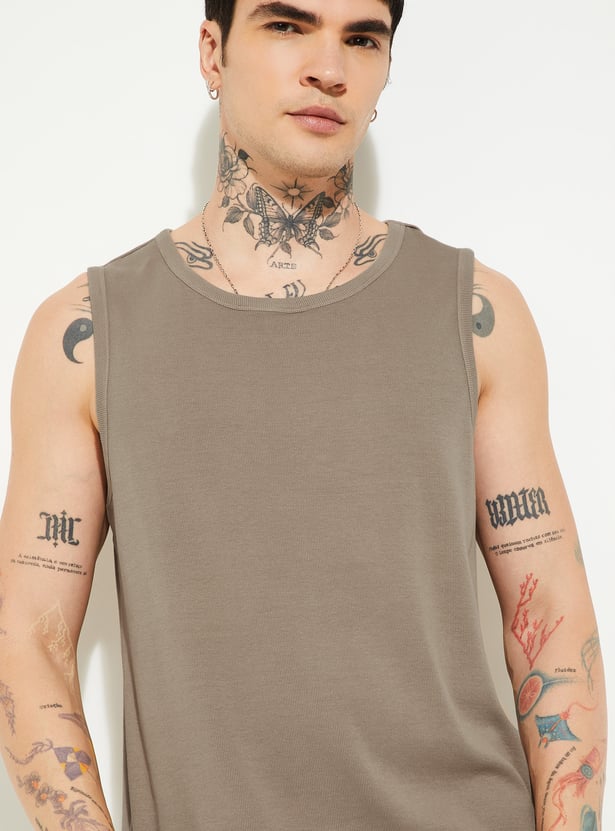 Keep it simple and stylish with this solid T-shirt. Featuring a round neck and sleeveless design, it offers a clean, minimal look with all-day comfort. Perfect as a versatile wardrobe staple, it can be worn solo or layered for effortless style.