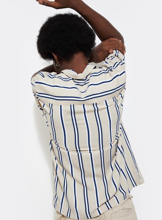 Go classic with this regular-fit shirt. It has a resort collar, half sleeves, and a striped pattern.
