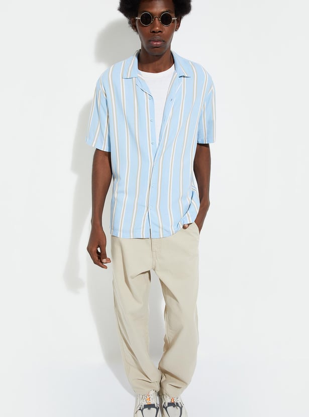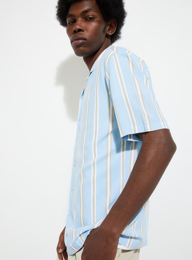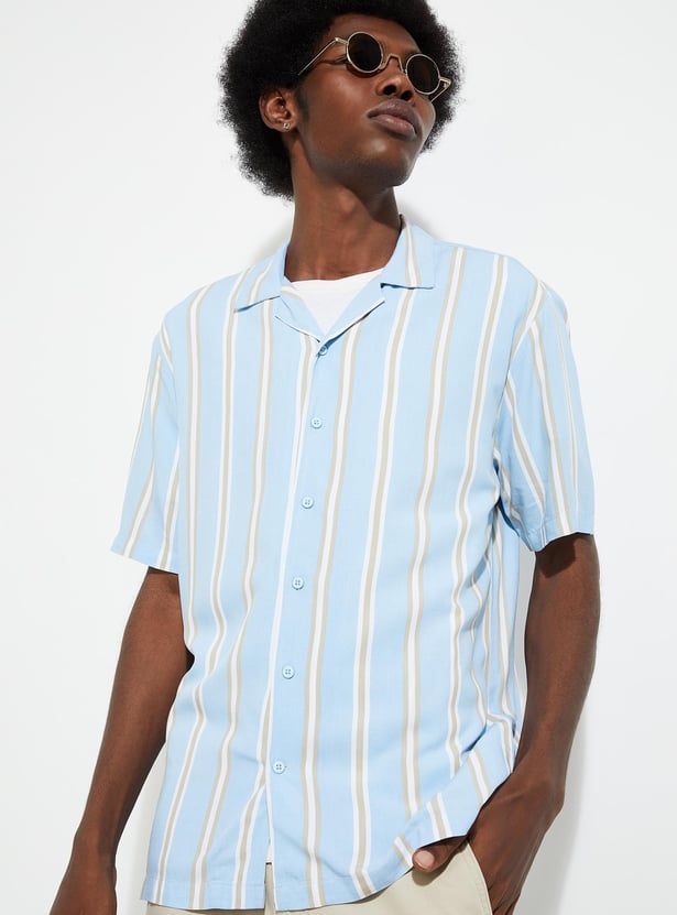 Go classic with this regular-fit shirt. It has a resort collar, half sleeves, and a striped pattern.