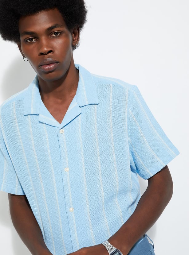 Elevate your summer style with this striped shirt boasting a resort collar and short sleeves.