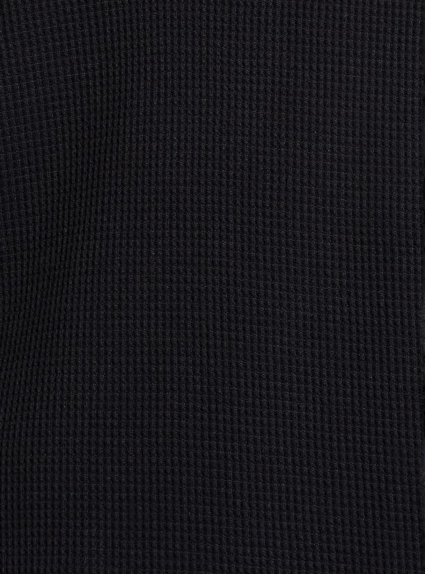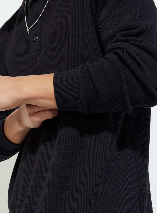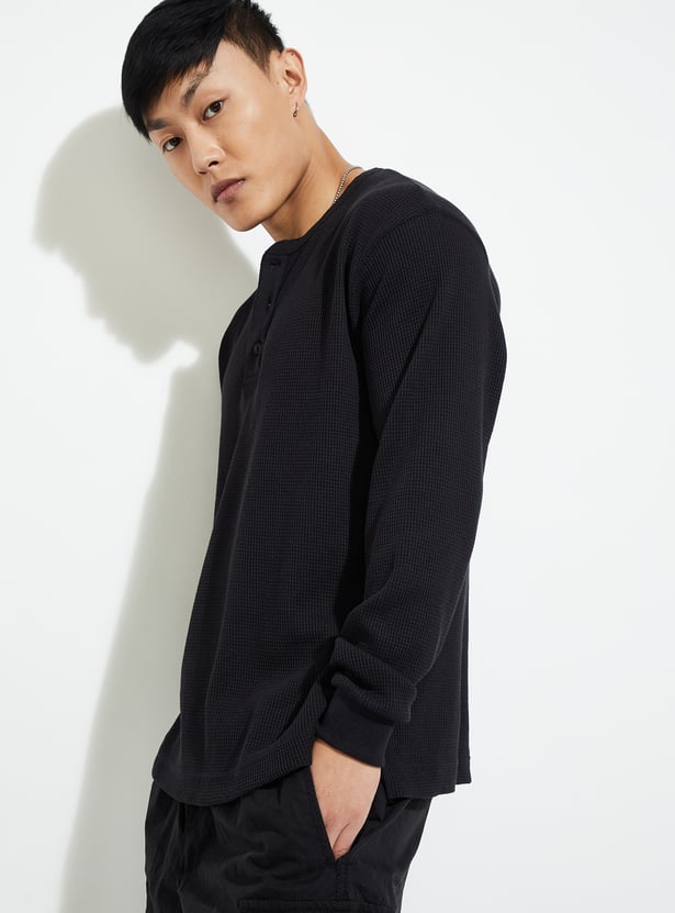 Elevate your weekend game with this trendy textured T-shirt. Featuring full sleeves and a laid-back Henley neck, it’s all about that effortless vibe. The unique texture adds a touch of visual interest, making it stand out in your casual wardrobe.