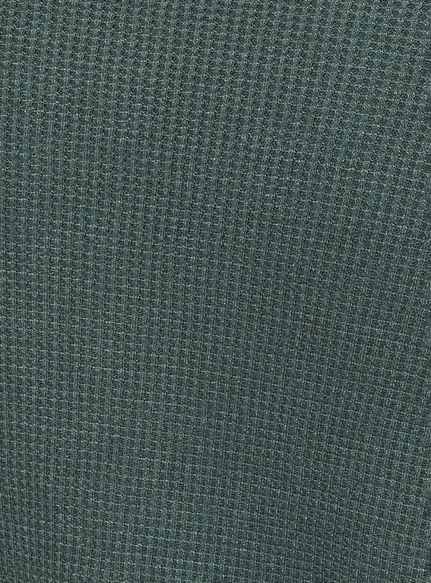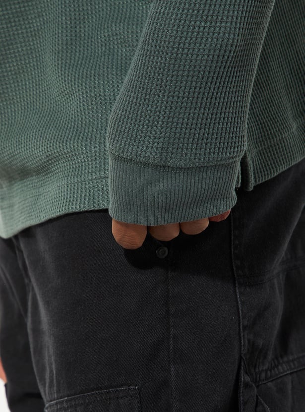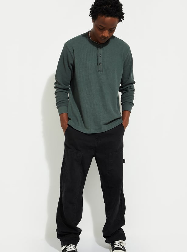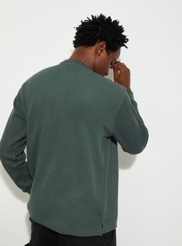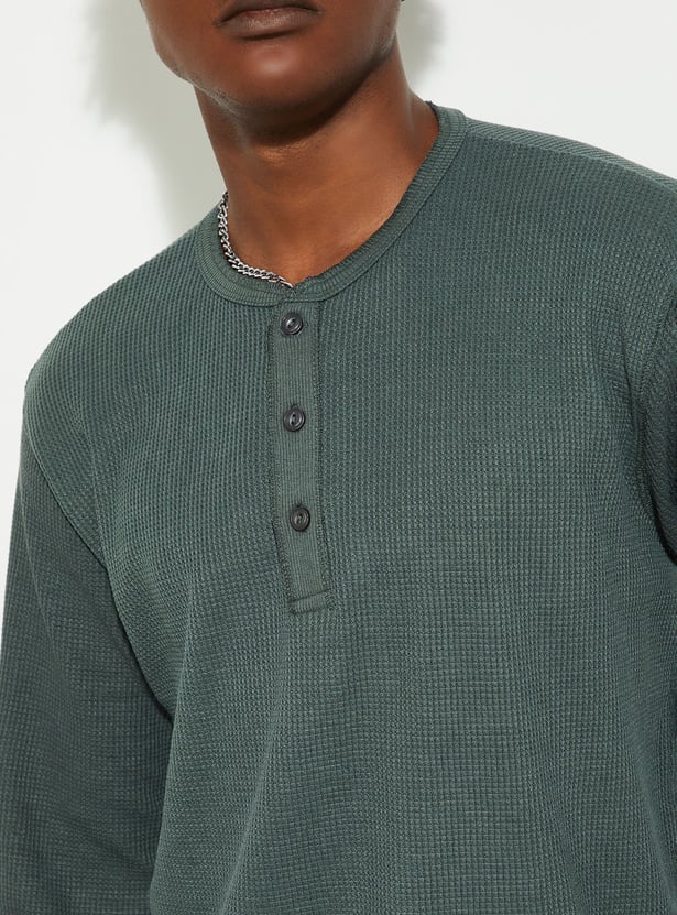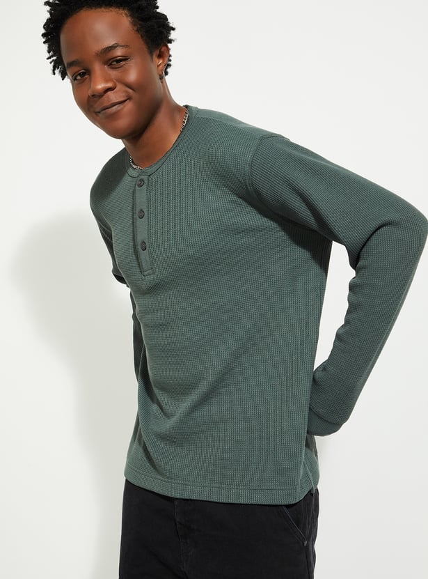 Elevate your weekend game with this trendy textured T-shirt. Featuring full sleeves and a laid-back Henley neck, it’s all about that effortless vibe. The unique texture adds a touch of visual interest, making it stand out in your casual wardrobe.