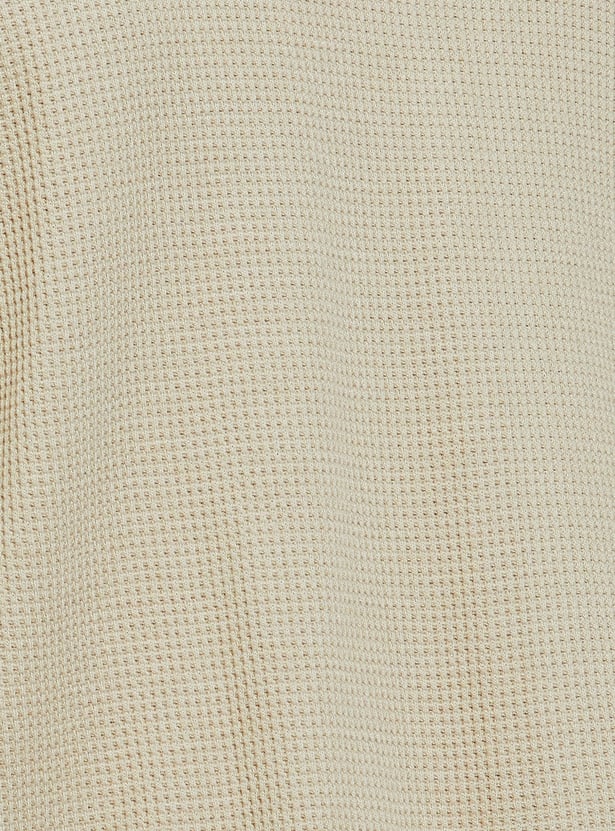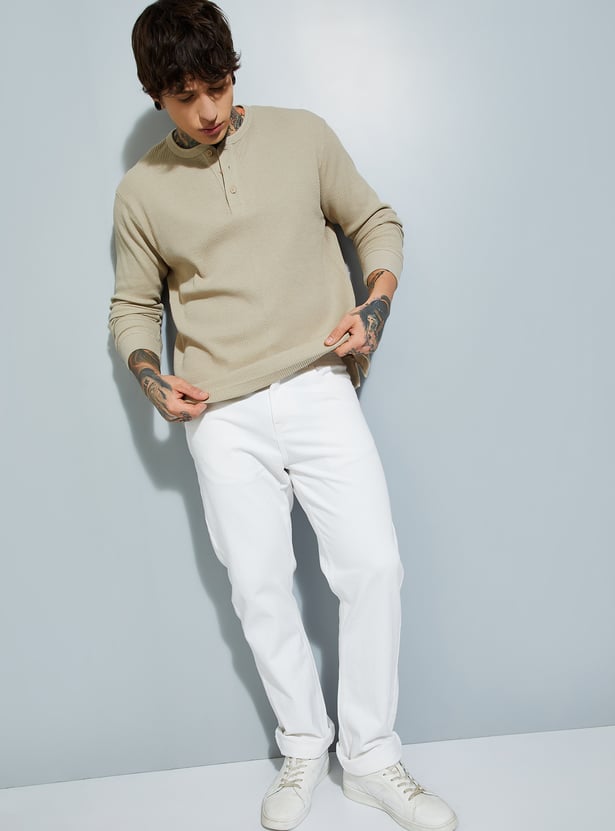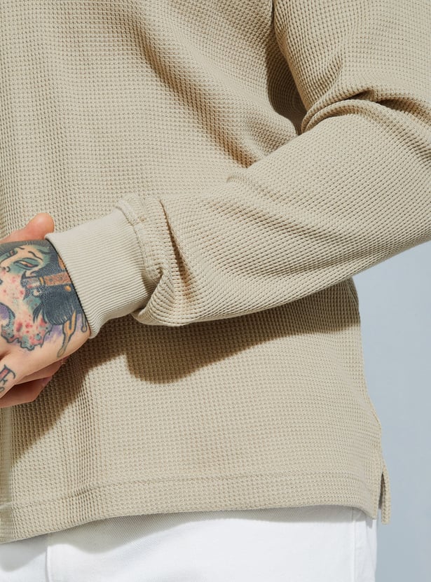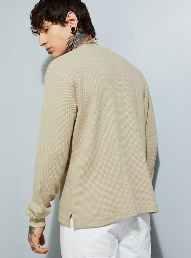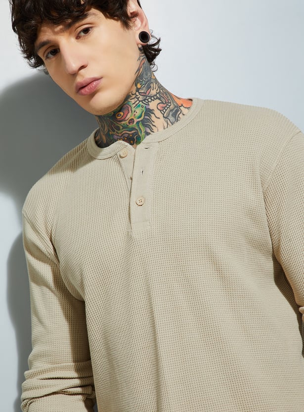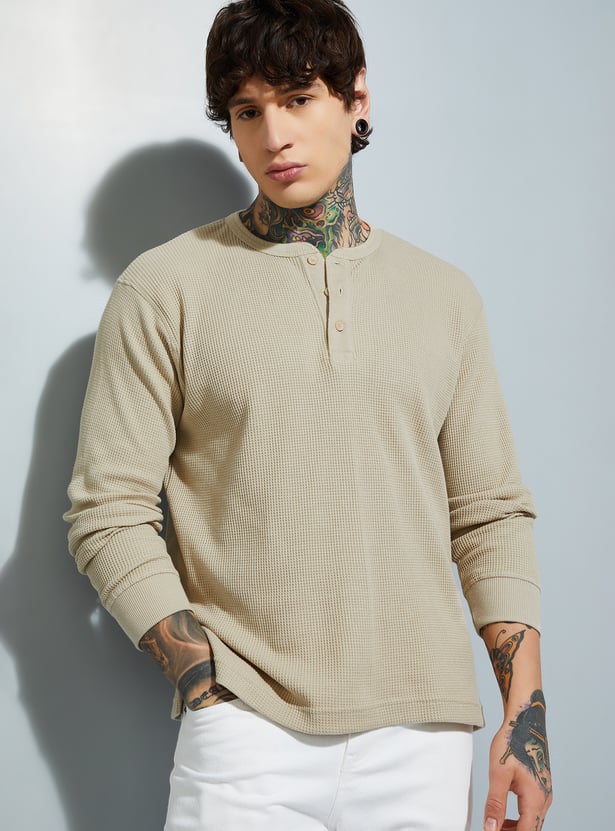 Add subtle detail to your casual wardrobe with this textured T-shirt. Featuring a Henley neck and full sleeves, it blends comfort with a touch of rugged charm. Perfect for layering or wearing solo in cooler weather.