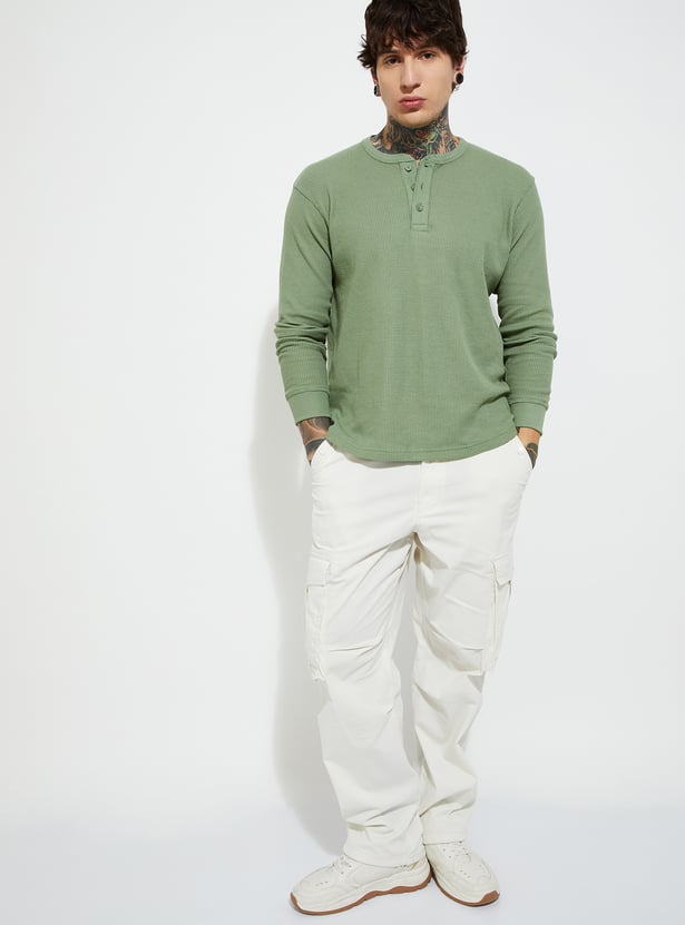 Add subtle detail to your casual wardrobe with this textured T-shirt. Featuring a Henley neck and full sleeves, it blends comfort with a touch of rugged charm. Perfect for layering or wearing solo in cooler weather.