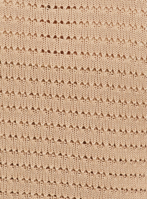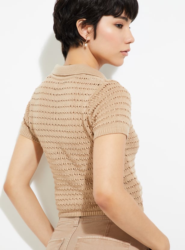 Give off chill vibes in this T-shirt. Showcasing a crop profile, it has an open-knit pattern for a cosy look. The Johnny collar and half sleeves with ribbed trim complete the look.
