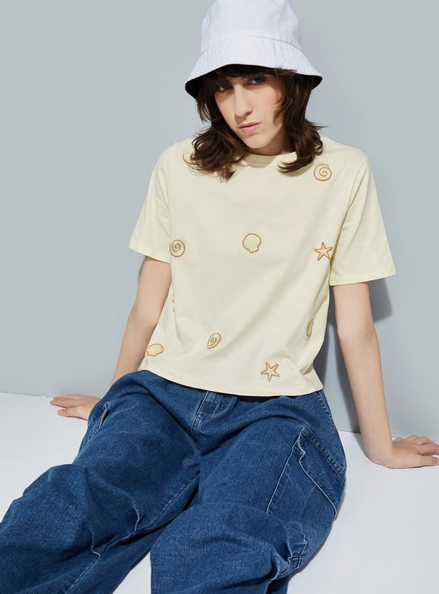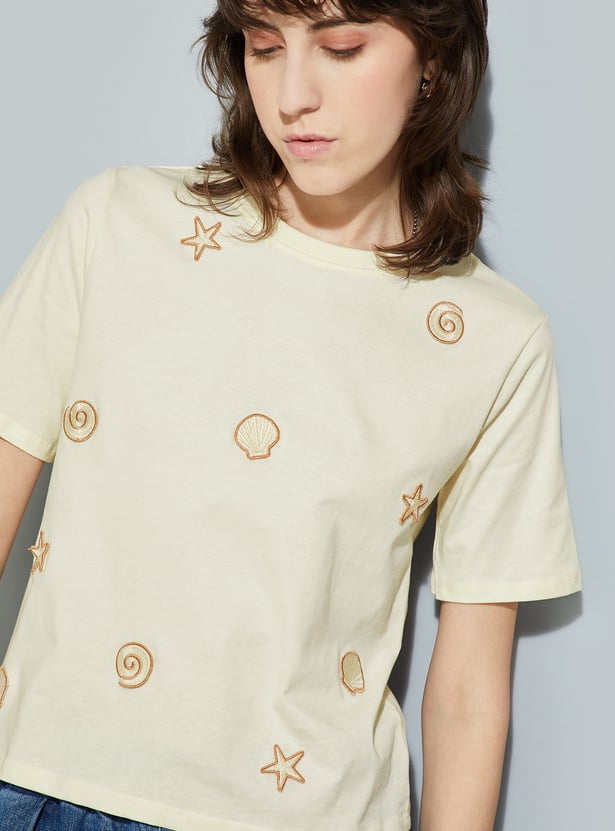 Add a playful touch to your everyday casual style with this trendy T-shirt. It is designed with a round neck, half sleeves, and an eye-catching embroidered applique detail on the front. This tee brings a fun element to a classic silhouette.