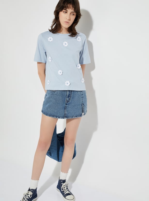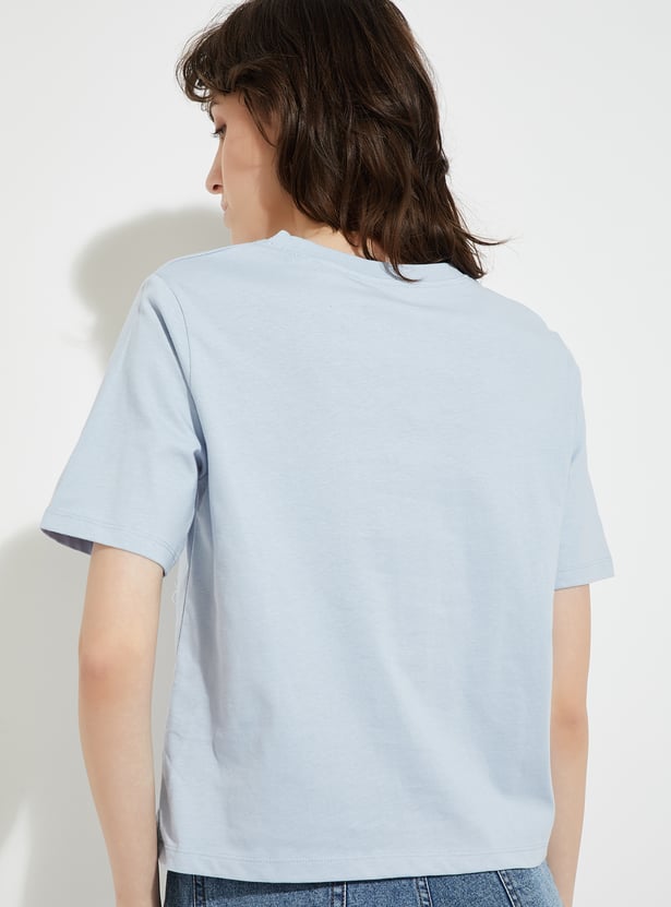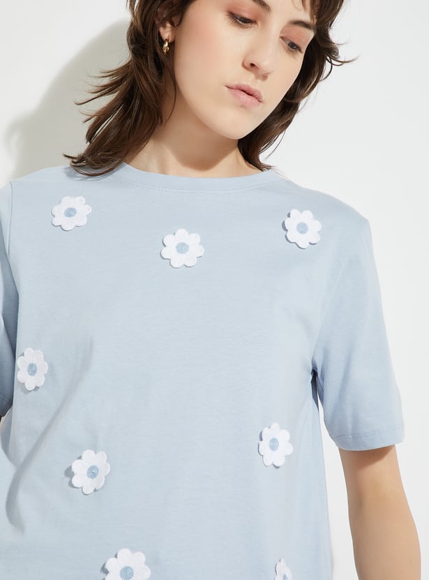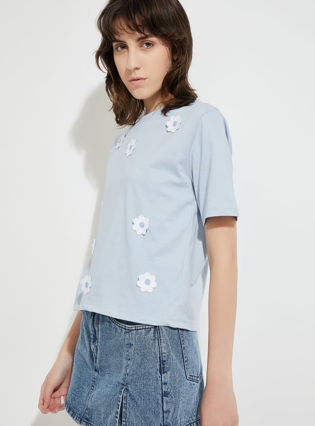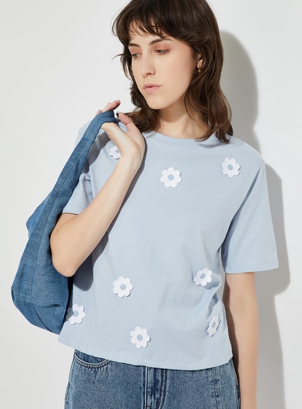 Add a playful touch to your everyday casual style with this trendy T-shirt. It is designed with a round neck, half sleeves, and an eye-catching embroidered applique detail on the front. This tee brings a fun element to a classic silhouette.