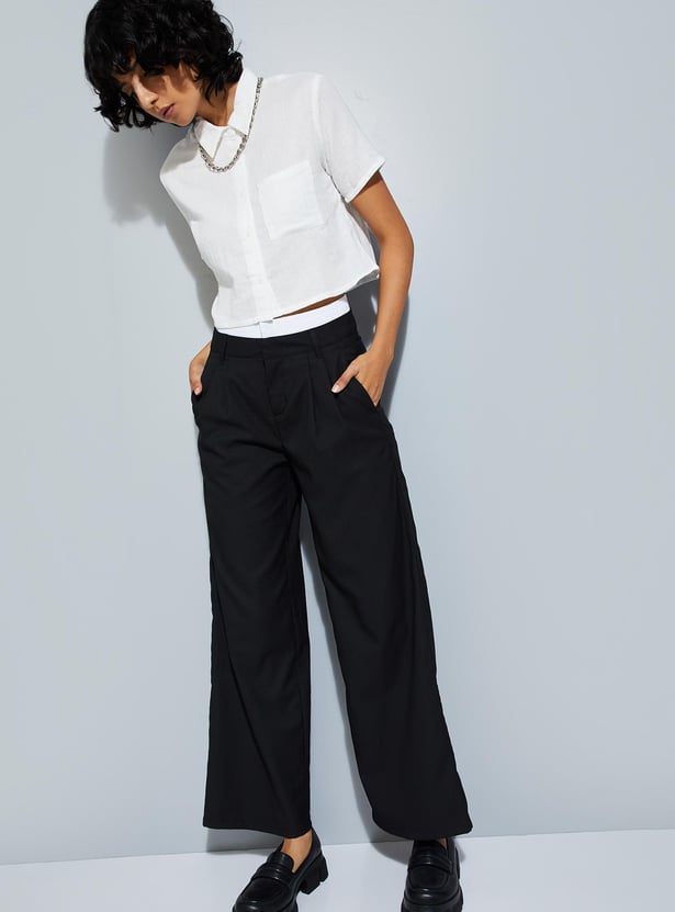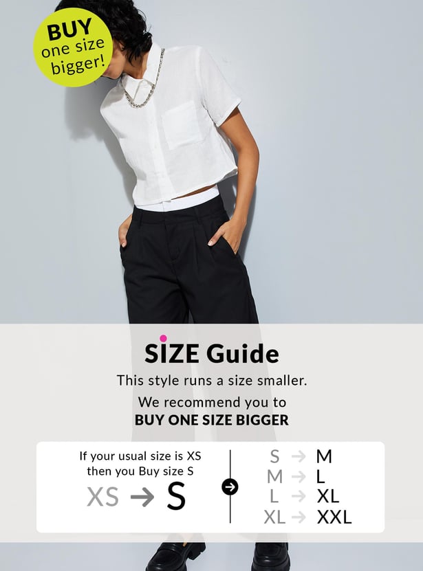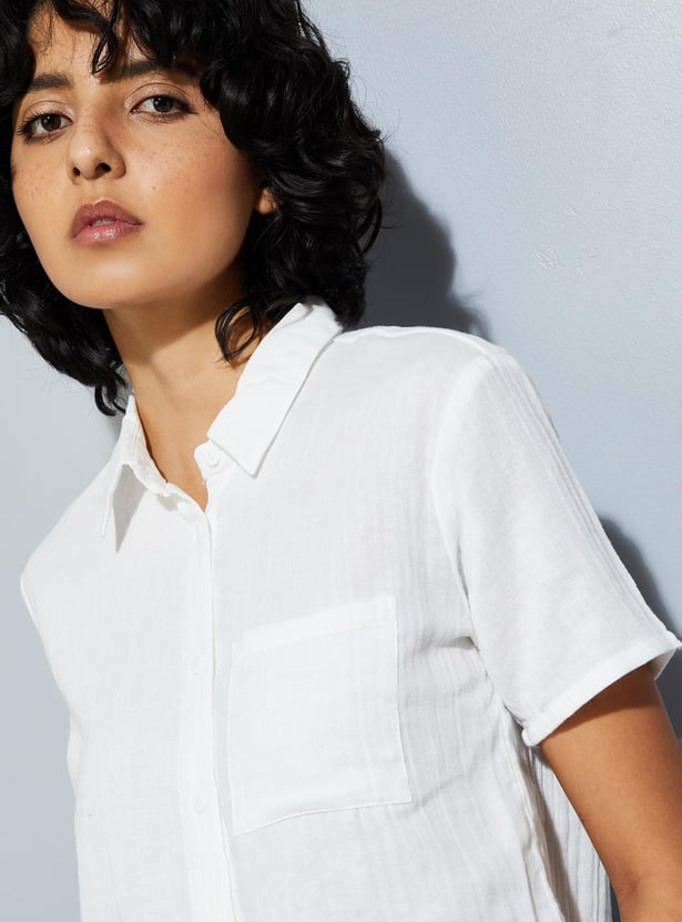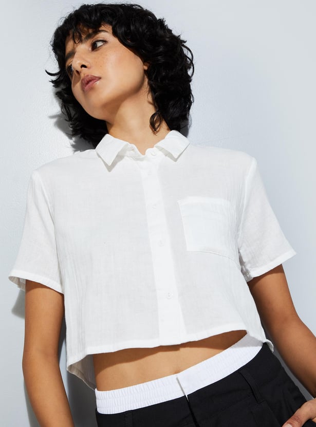 Stay ahead of the fashion curve with this shirt boasting a trendy crinkled texture, spread collar, half sleeves, and cropped profile. Perfect for urban summer vibes, it adds a stylish edge to your look while keeping you cool and comfortable in the heat.