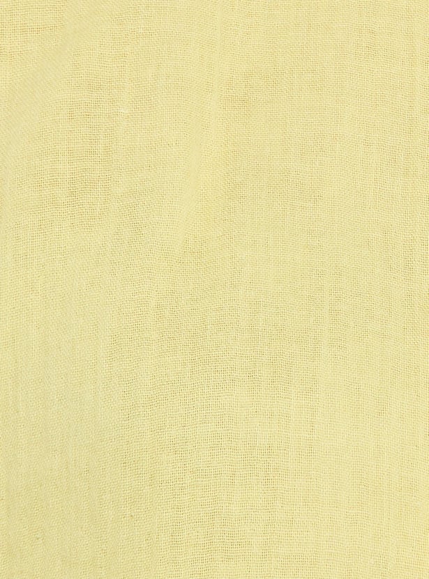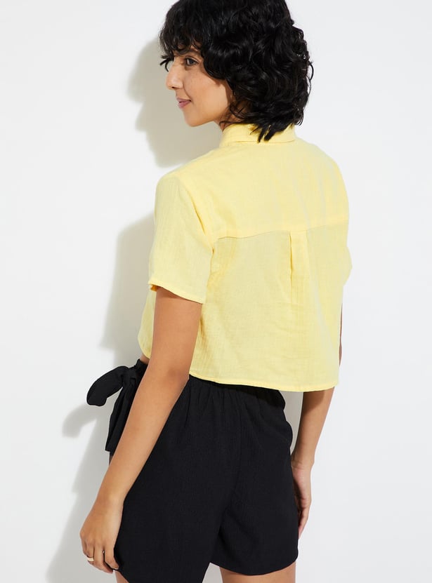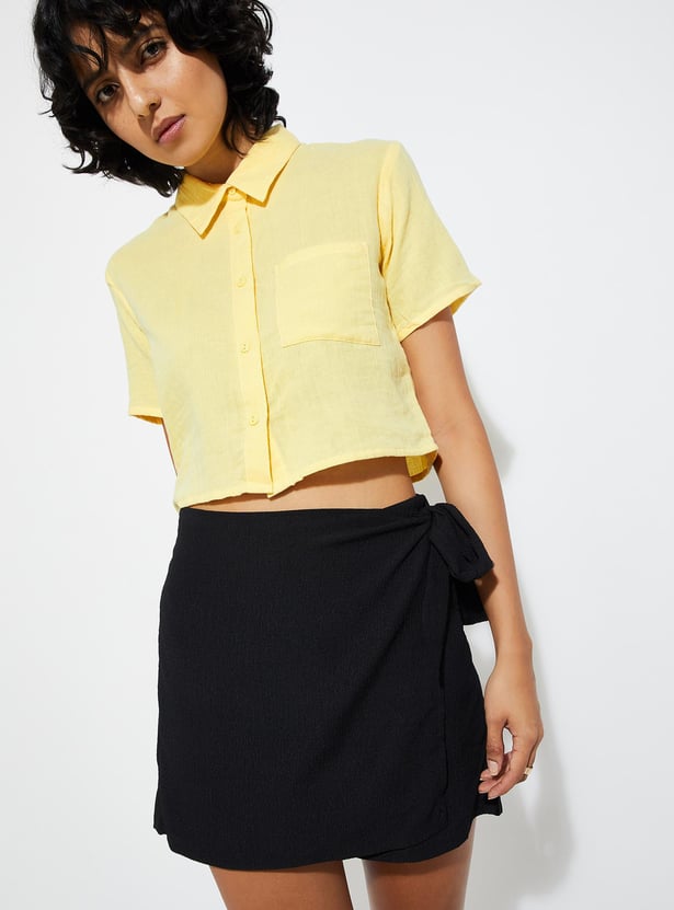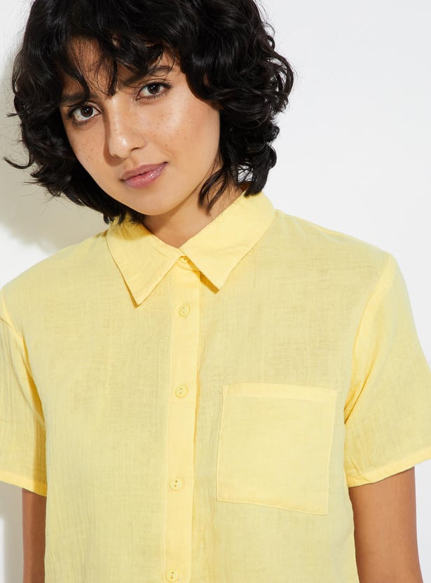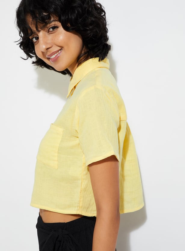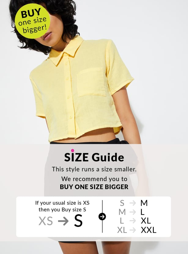 Stay ahead of the fashion curve with this shirt boasting a trendy crinkled texture, spread collar, half sleeves, and cropped profile. Perfect for urban summer vibes, it adds a stylish edge to your look while keeping you cool and comfortable in the heat.