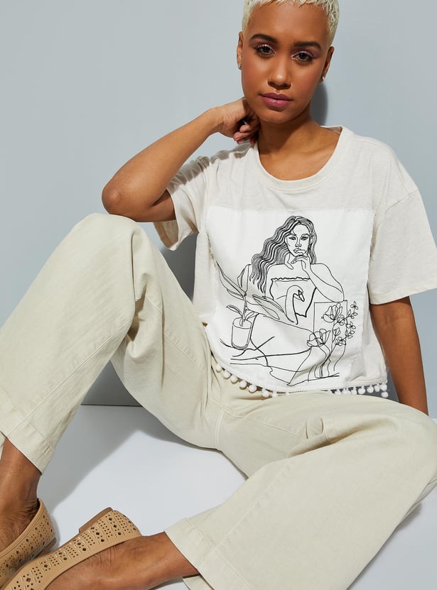 Enhance your daily style with this trendy t-shirt. Featuring a chic graphic print, round neck, half sleeves, and playful pom-pom lace at the hem, it adds a touch of flair to your everyday wardrobe.