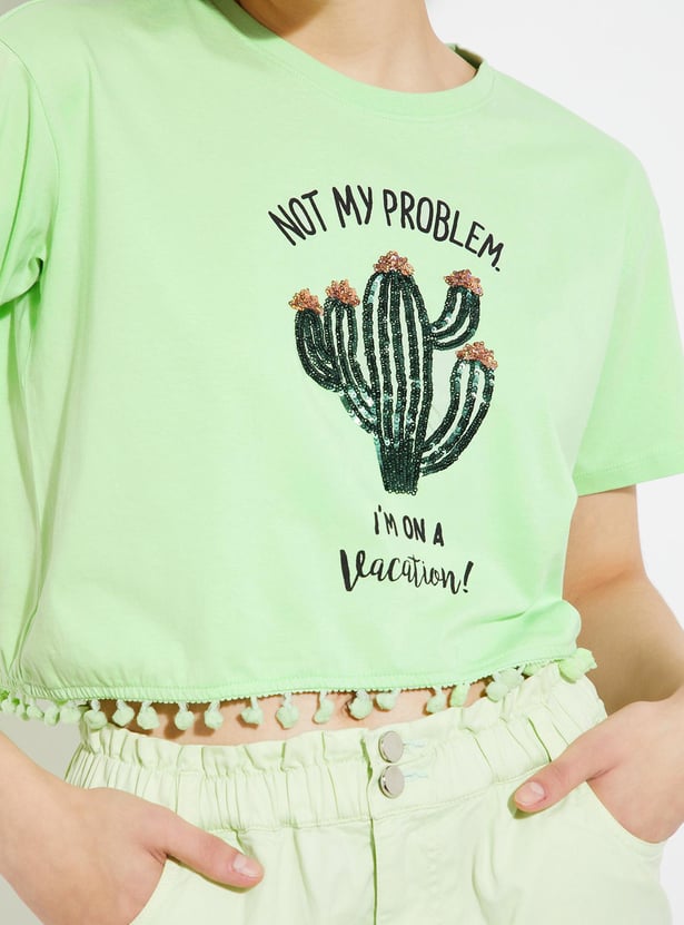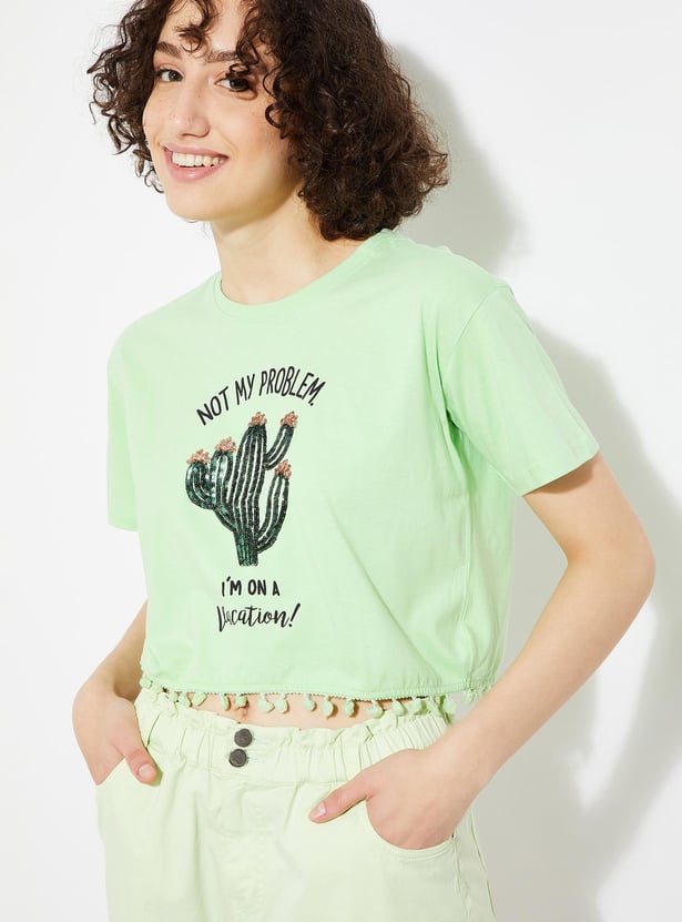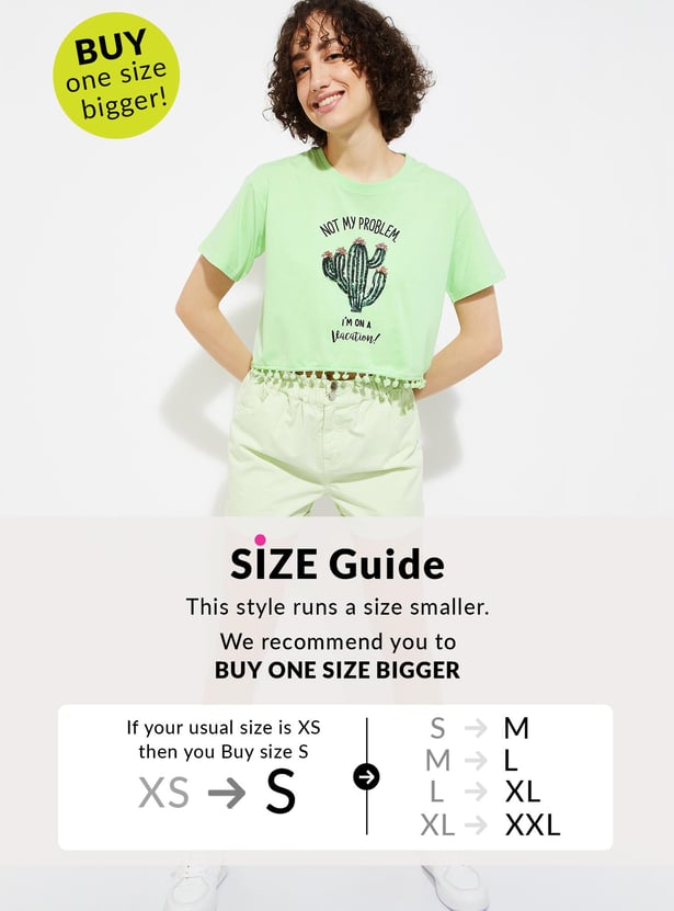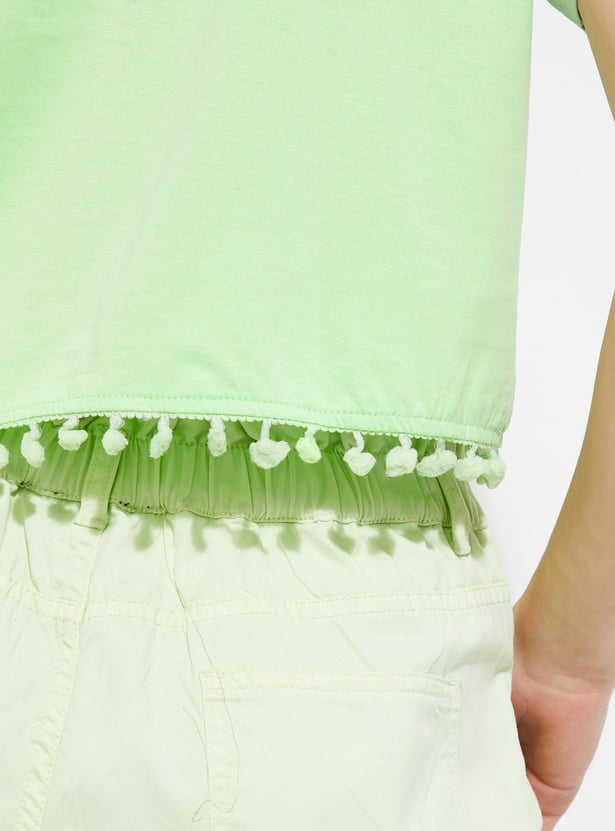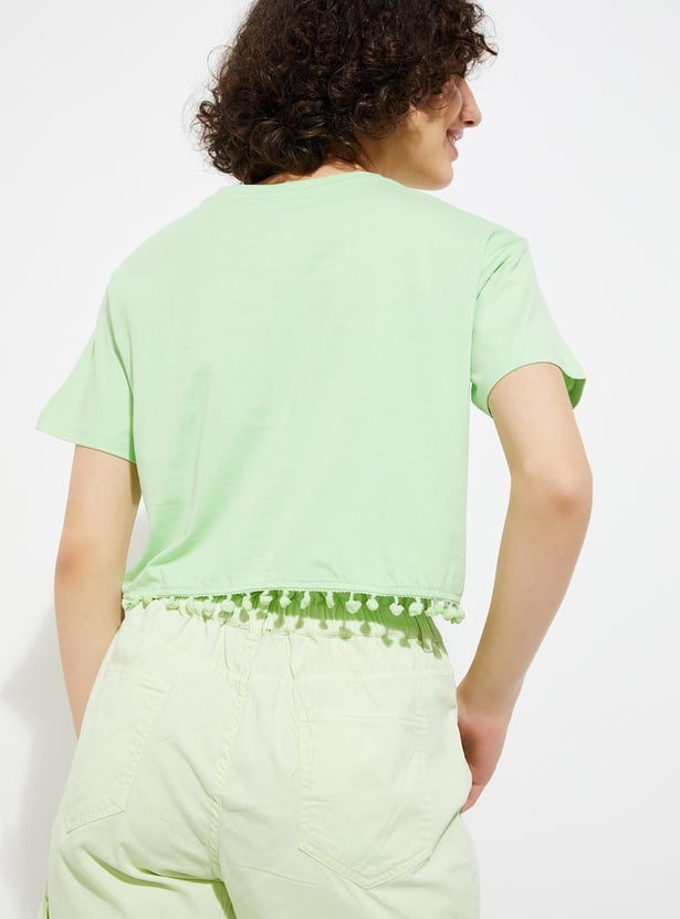 Enhance your daily style with this trendy t-shirt. Featuring a chic graphic print, round neck, half sleeves, and playful pom-pom lace at the hem, it adds a touch of flair to your everyday wardrobe.
